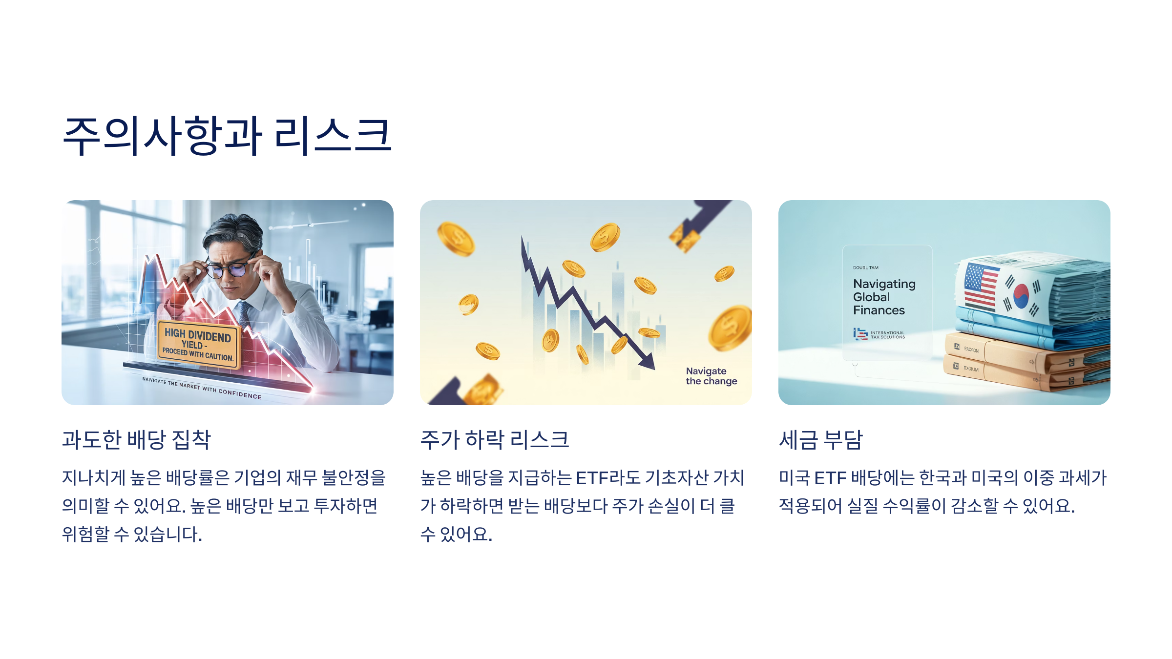 다음 섹션에서는 고배당 ETF 투자할 때 주의해야 할 점들을 정리해드릴게요!