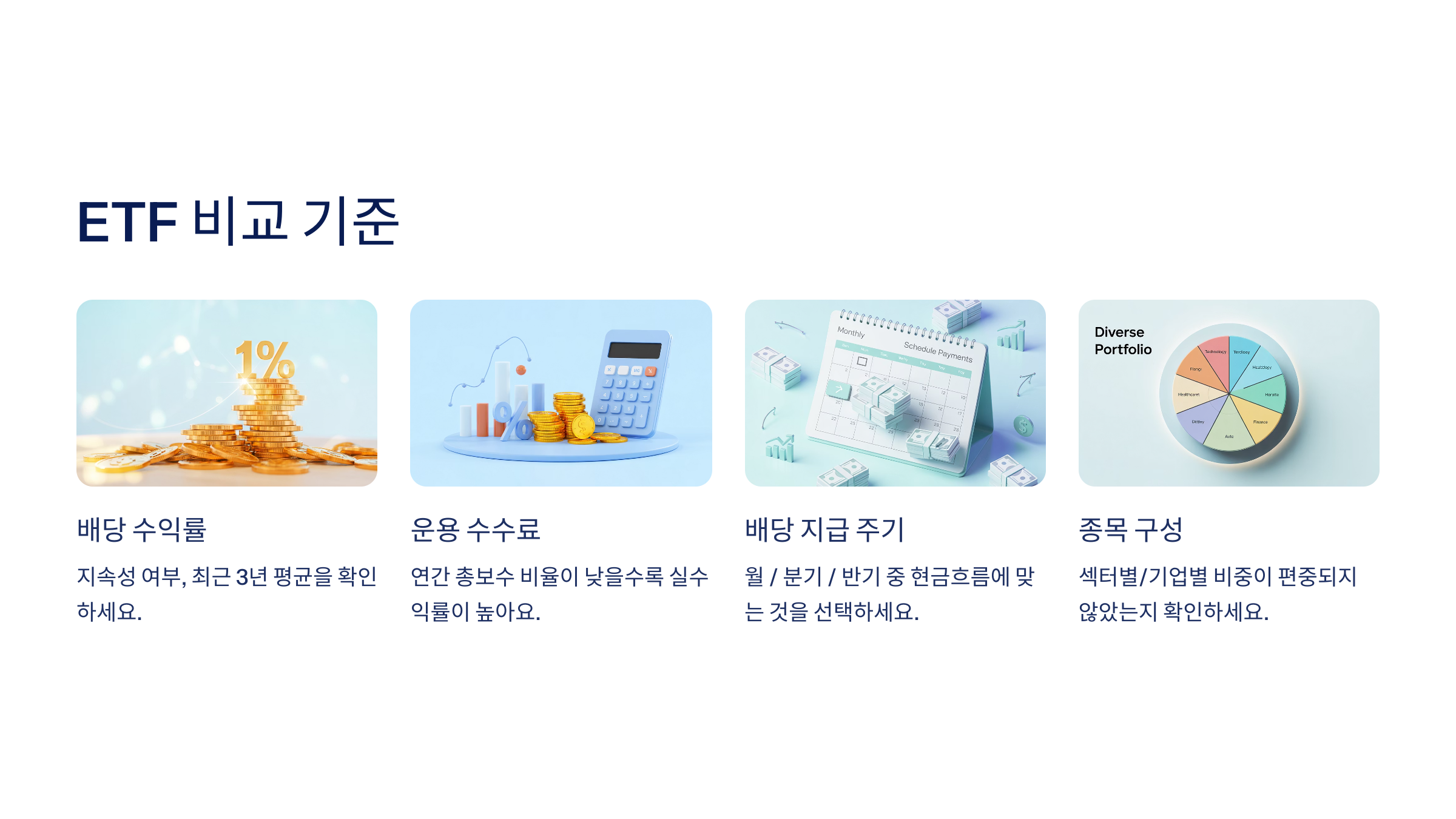 고배당 ETF는 배당 수익률이 높은 것만 보면 안 돼요. 겉보기 수익률이 높아도 실제 성과는 저조하거나, 장기적으로 자산이 깎일 수 있어요. 제대로 고르려면 몇 가지 핵심 비교 기준이 필요해요. 🎯📊