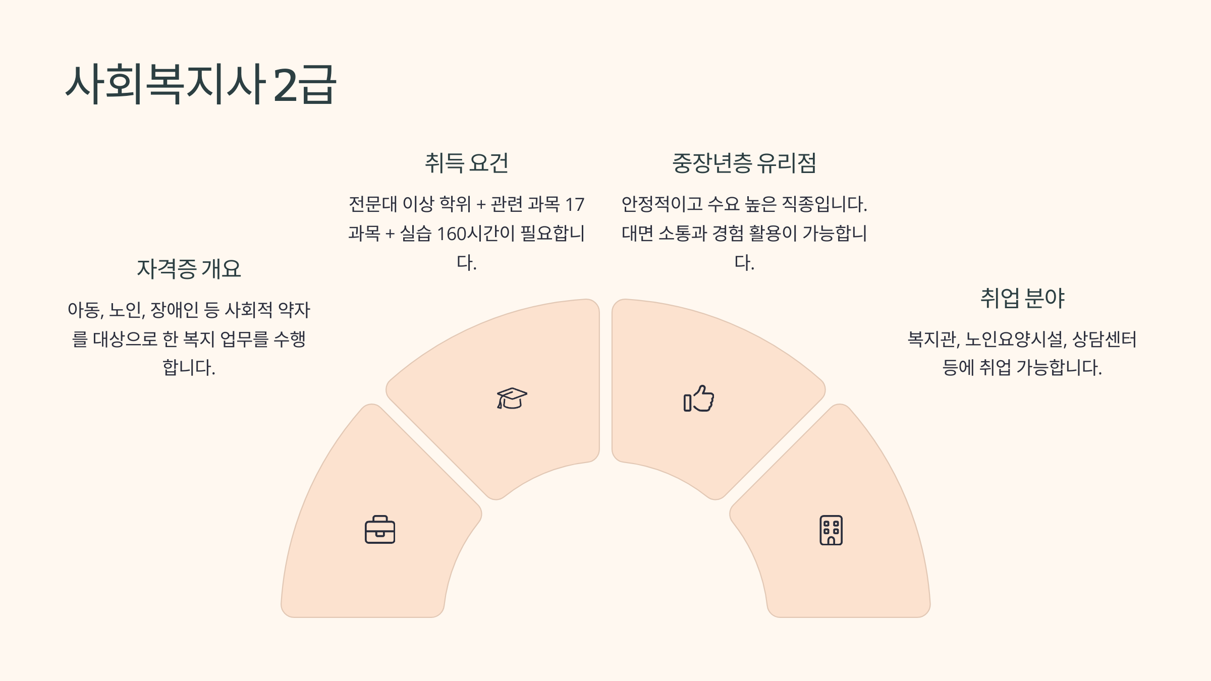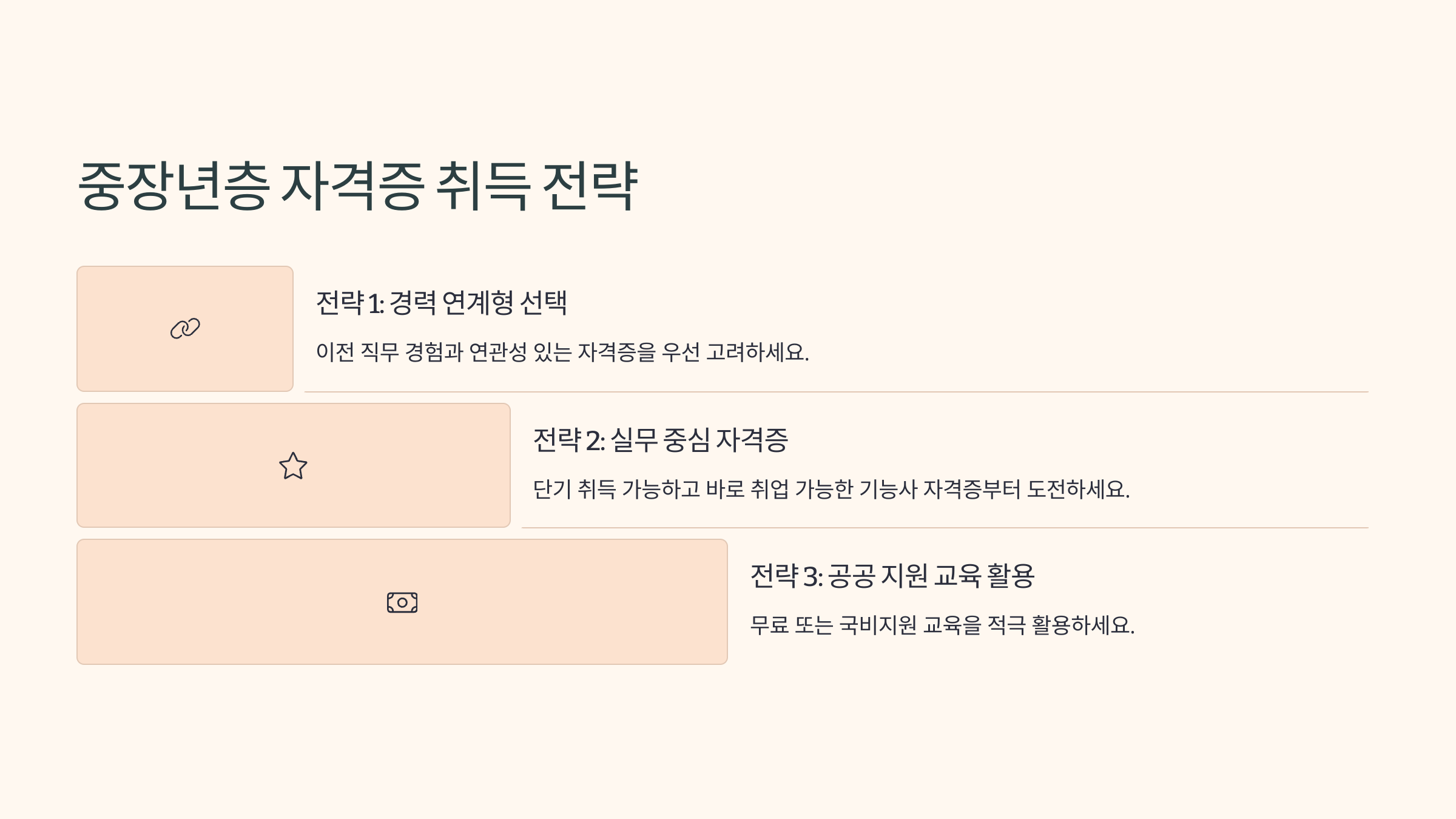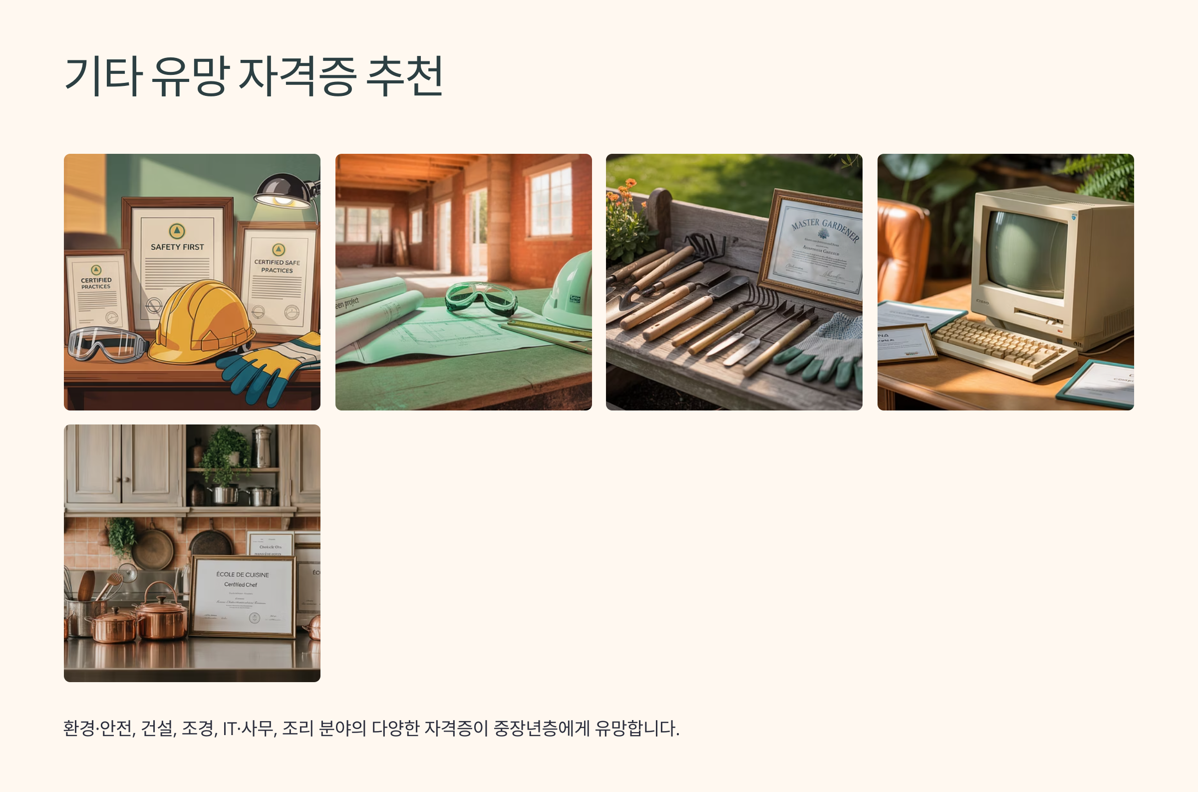 중장년층에게 자격증은 단지 ‘공부’가 아니라 새로운 시작의 열쇠입니다. 자신의 경험을 녹여 더 큰 가치를 창출할 수 있고, 안정적인 수입과 함께 사회적 연결망을 유지하는 중요한 수단이 됩니다.