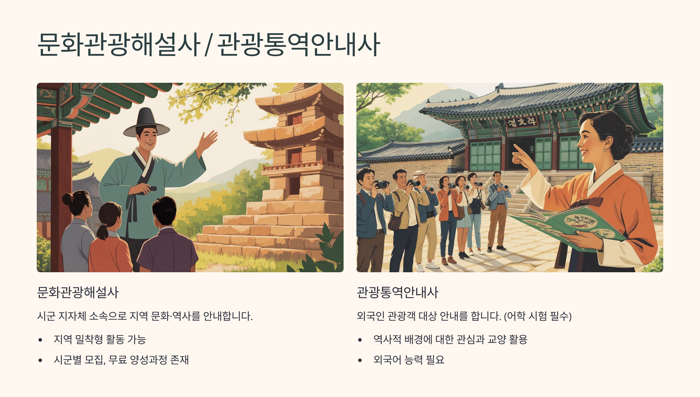- 문화관광해설사: 시군 지자체 소속으로 지역 문화·역사 안내