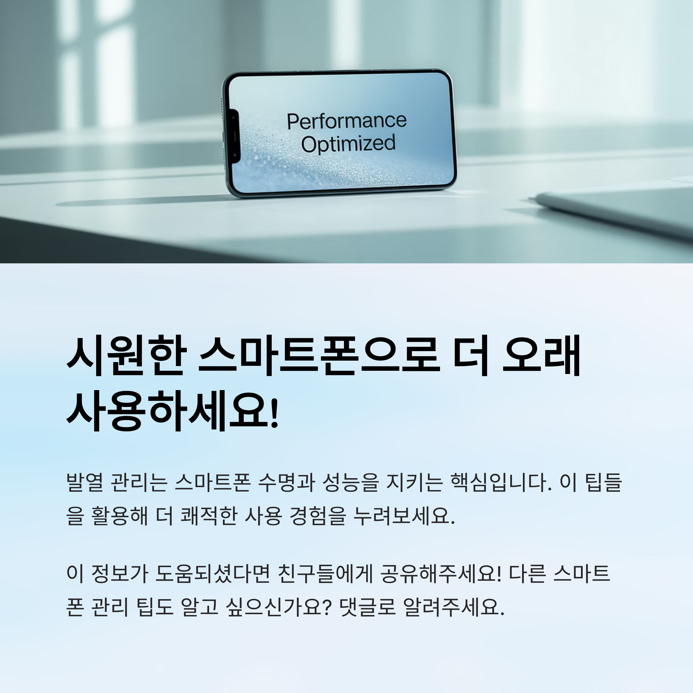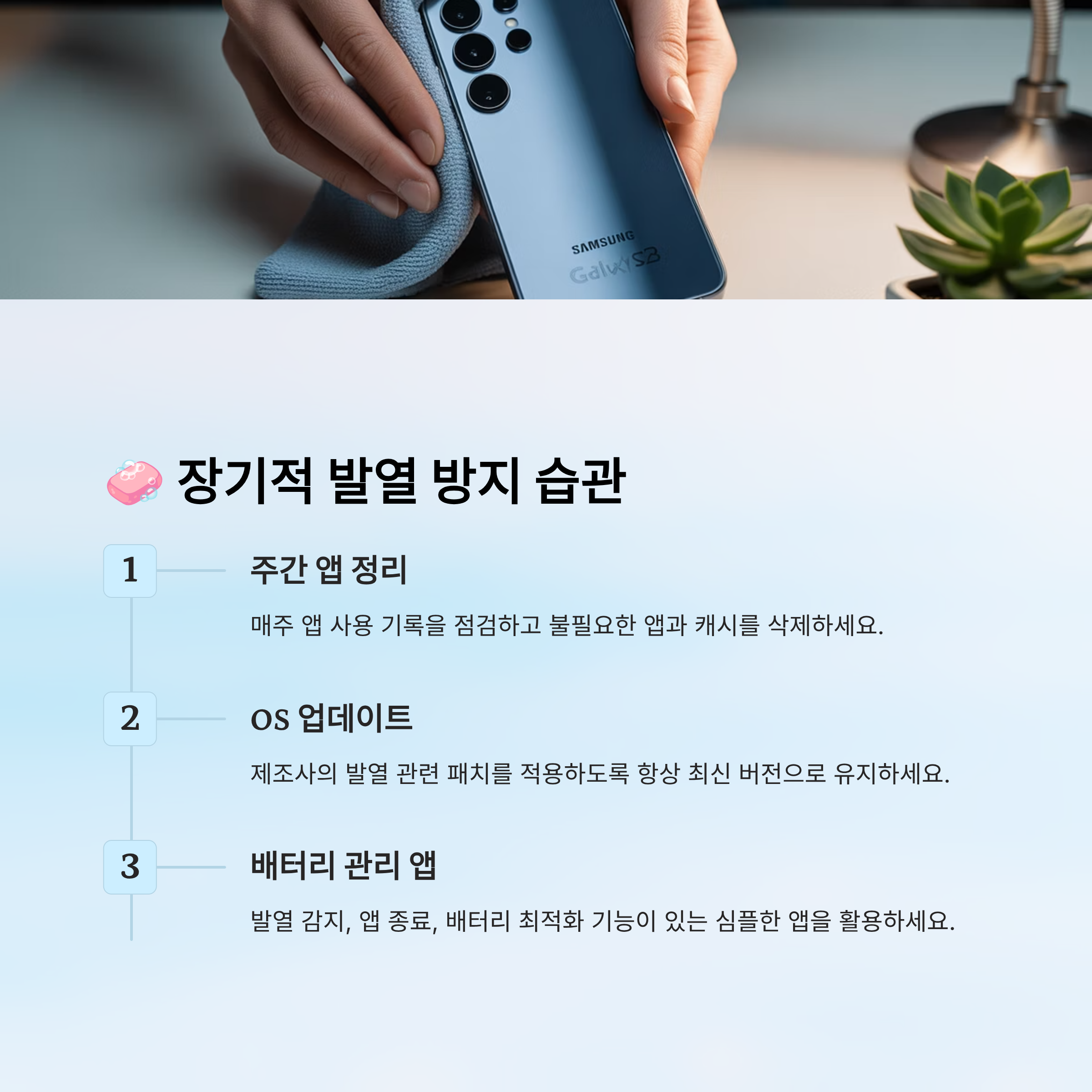 발열은 단기간에 해결하는 것도 중요하지만, 평소 관리 습관이 더욱 큰 영향을 미쳐요. 꾸준히 좋은 습관을 가지면 스마트폰이 오래가고, 발열도 거의 생기지 않아요.