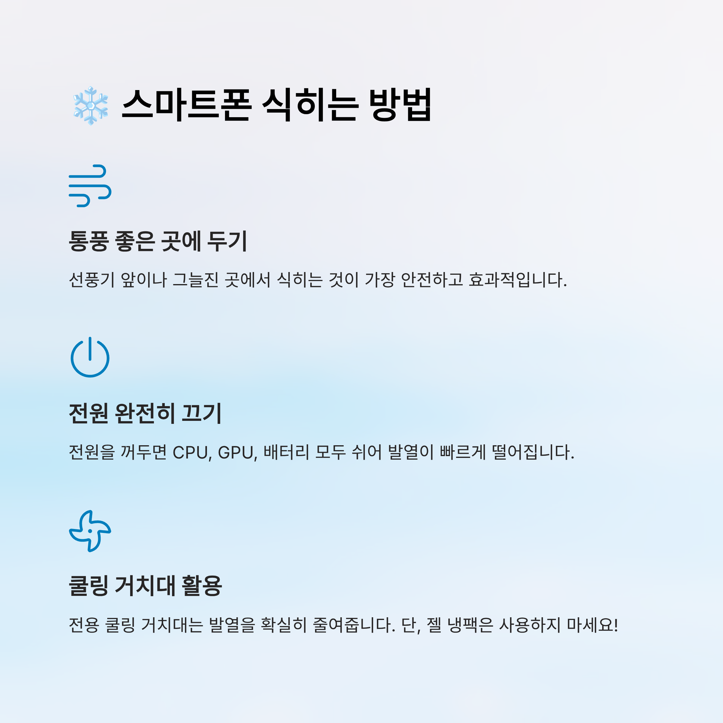 스마트폰이 너무 뜨거워졌을 때는 일단 빠르게 열을 식히는 게 급선무예요. 무턱대고 냉장고에 넣거나 얼음팩 위에 올리는 건 위험하니까 주의해야 해요.🙅‍♀️