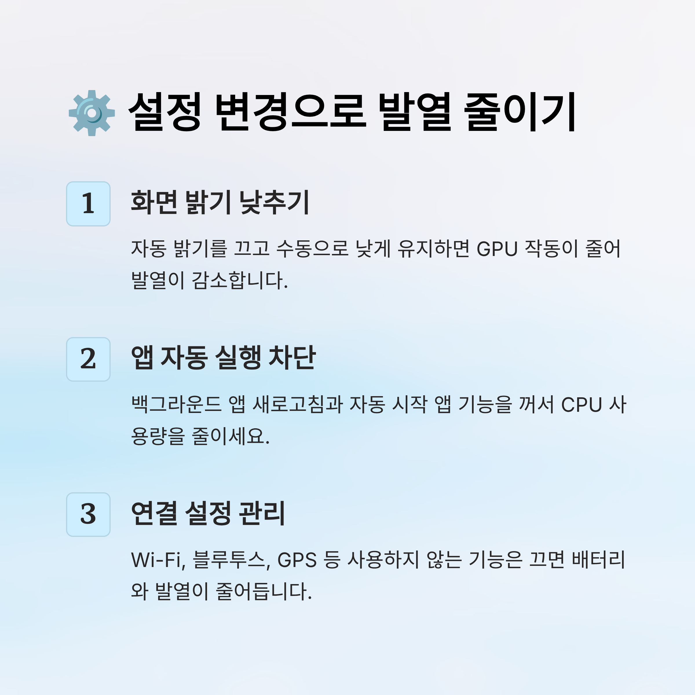 스마트폰도 결국 전자기기예요. 불필요한 기능은 꺼두고, 꼭 필요한 앱만 실행하는 습관이 발열 억제의 핵심이에요.