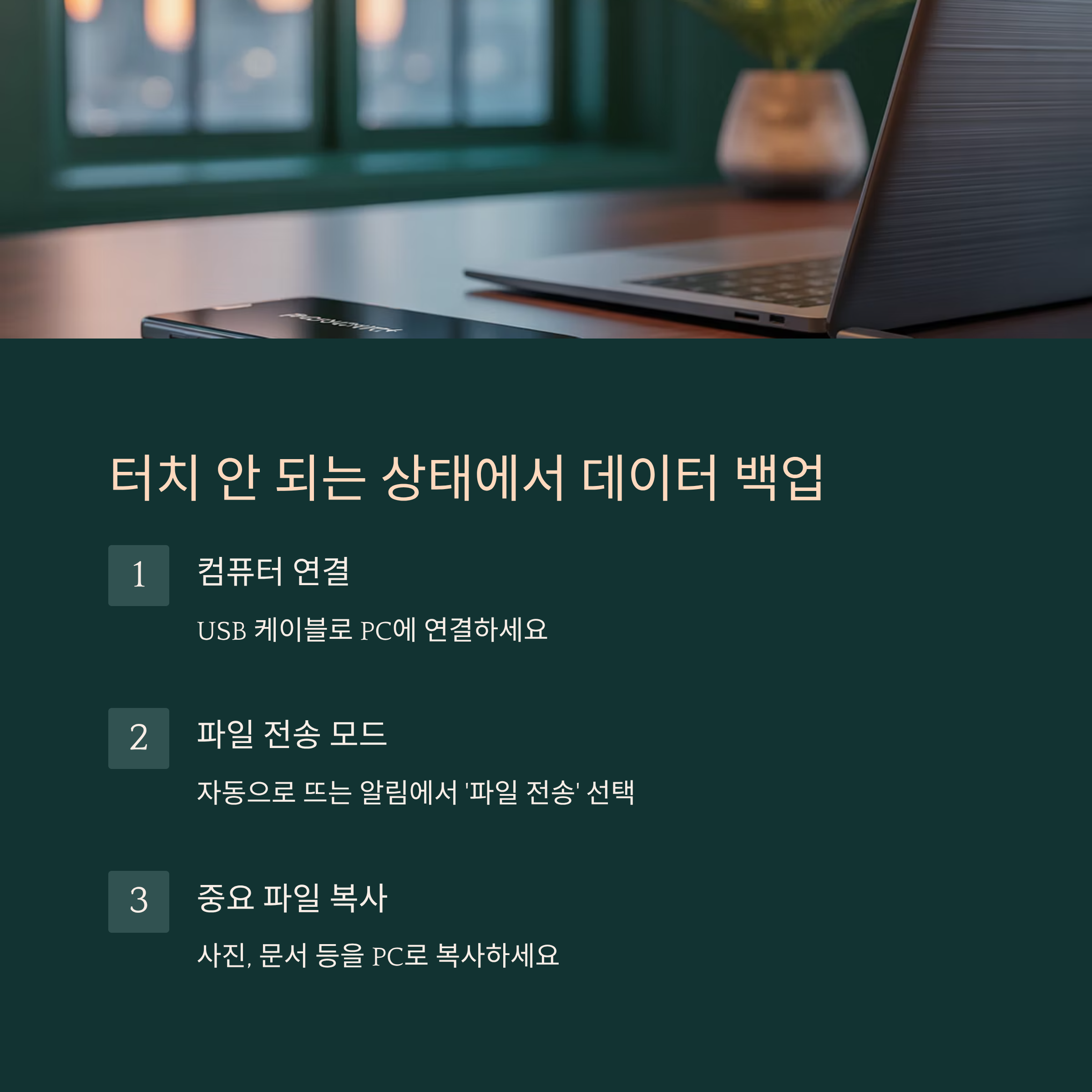 화면에 문제 없고 습기도 없다면 다음 단계는 데이터 백업이에요. 터치가 전혀 안 되는 상황에서도 중요한 사진이나 연락처를 살리는 방법을 알려드릴게요.