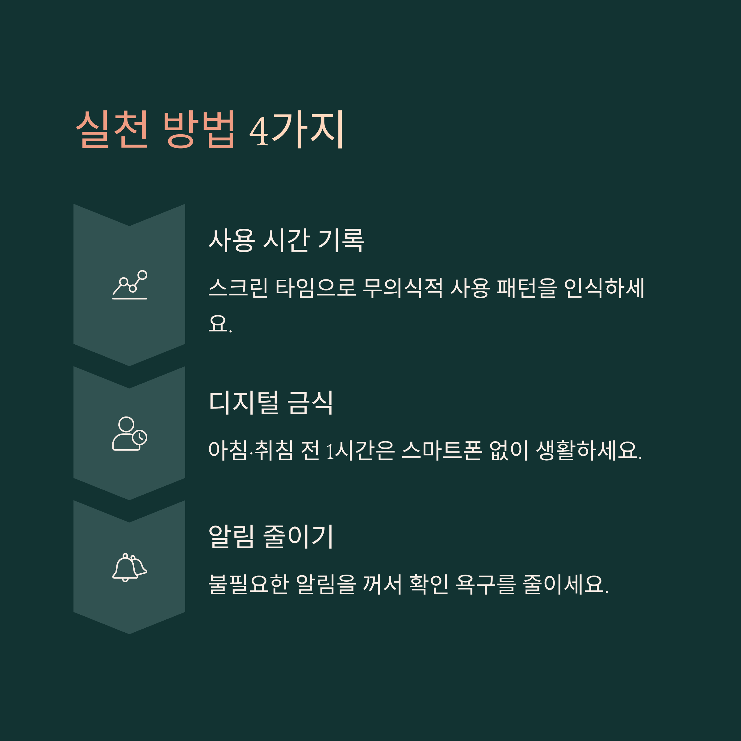 이제 스마트폰 중독이 얼마나 다양한 영역에 영향을 미치는지 알게 되었으니, 다음 단계에서는 이를 해결하기 위한 구체적인 실천 방법을 살펴볼 차례예요.