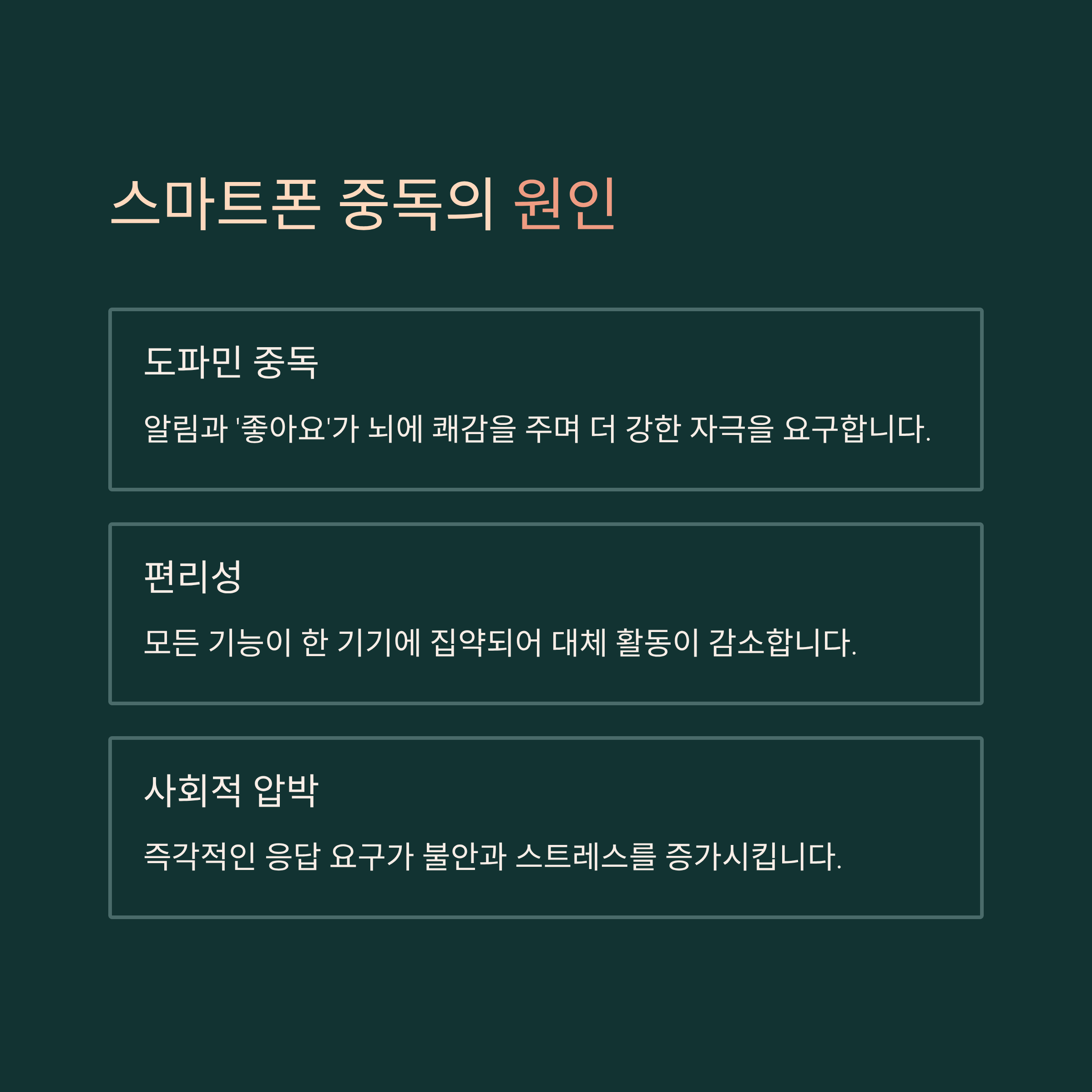 | 도파민 중독 | 알림과 보상에 반복적으로 반응 | 더 강한 자극 요구 |
