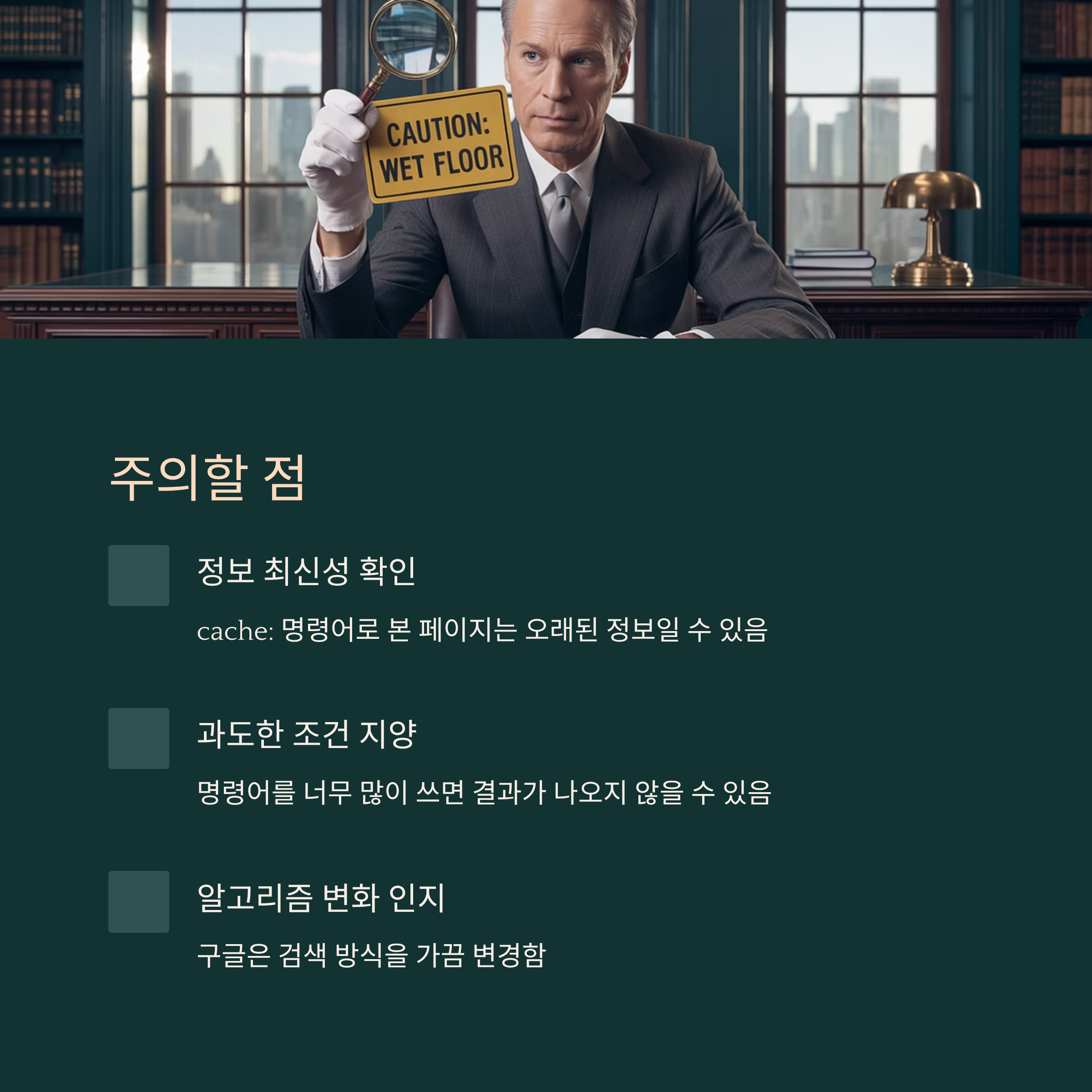 여기까지 익혔다면 검색은 운이 아니라 설계라는 걸 체감하게 돼요. 다음 박스에서 명령어 사용 시 주의할 점을 이어서 정리해 줄게요. 숨은 함정들을 알면 정확도와 효율이 더 올라가요.