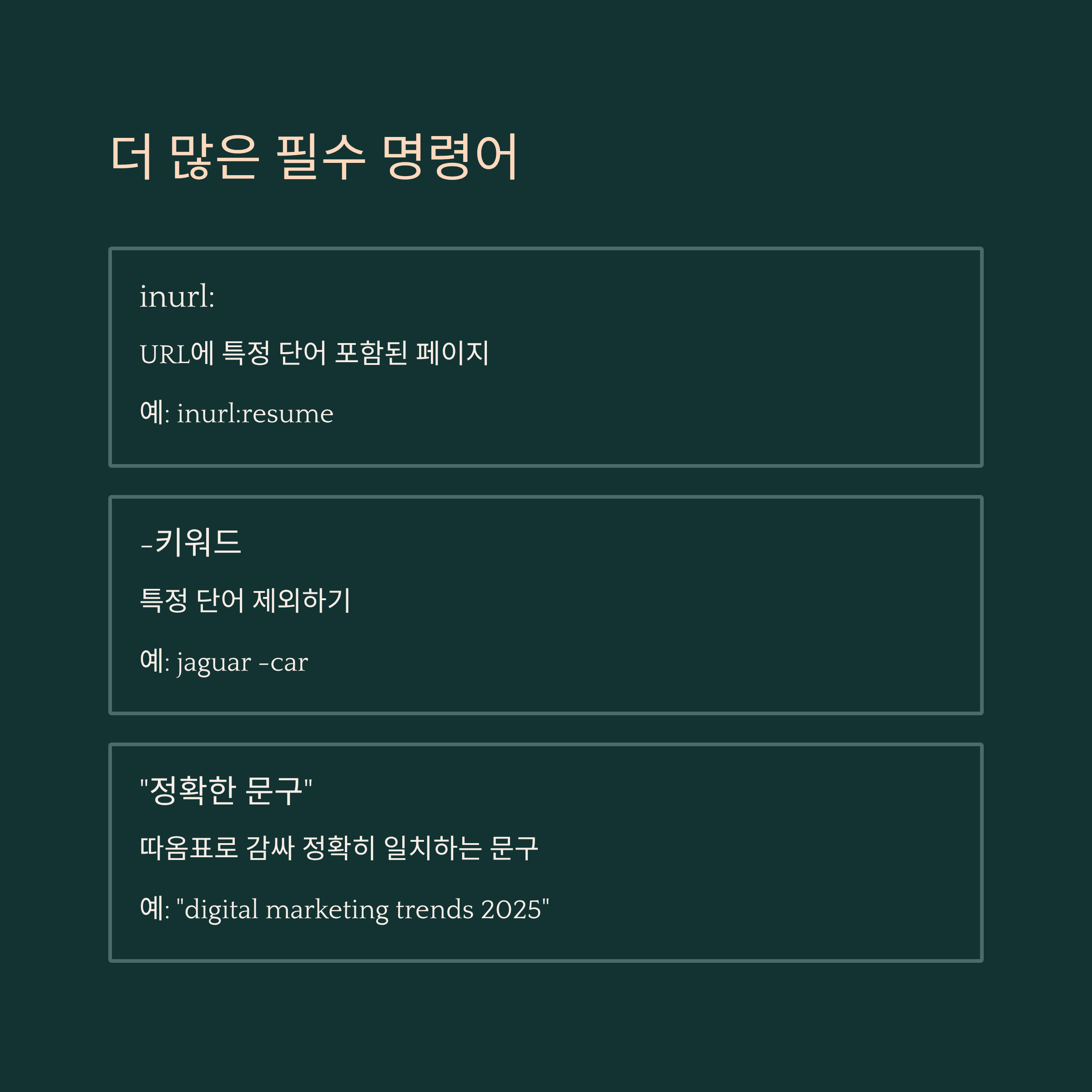 이 10가지 명령어만 잘 써도 검색 속도와 정확도가 확 달라져요. 다음 섹션에서는 이 명령어들을 활용해 검색 시간을 절반으로 줄이는 방법을 알려줄게요.