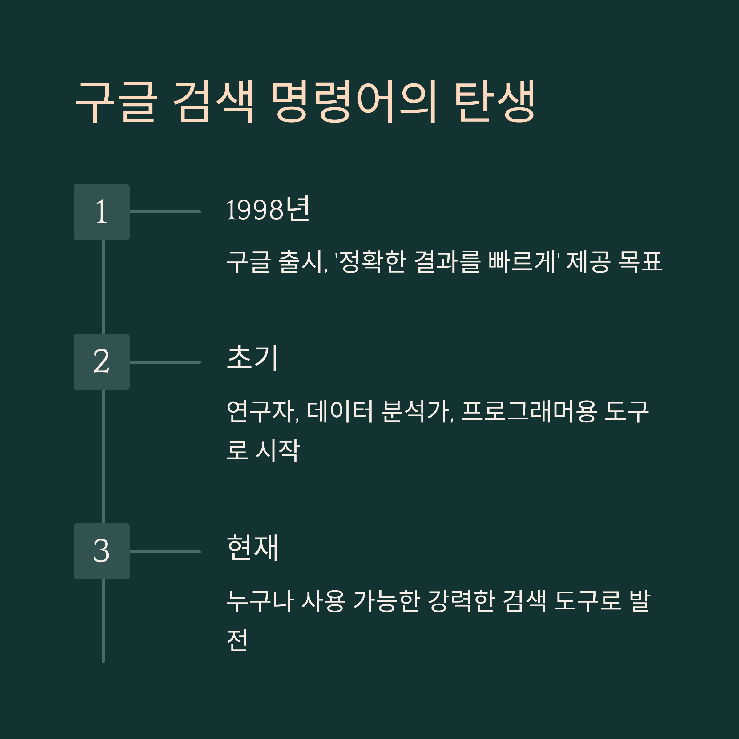구글이 처음 세상에 나온 건 1998년이에요. 당시만 해도 인터넷은 지금처럼 방대하지 않았고, 검색 엔진도 여러 가지가 있었어요. 하지만 구글은 ‘정확한 결과를 빠르게’ 제공하는 것을 최우선으로 삼았죠. 그러다 보니 개발자들은 단순한 키워드 검색보다 더 세밀하게 원하는 정보를 찾을 수 있는 ‘명령어’를 만들기 시작했어요.