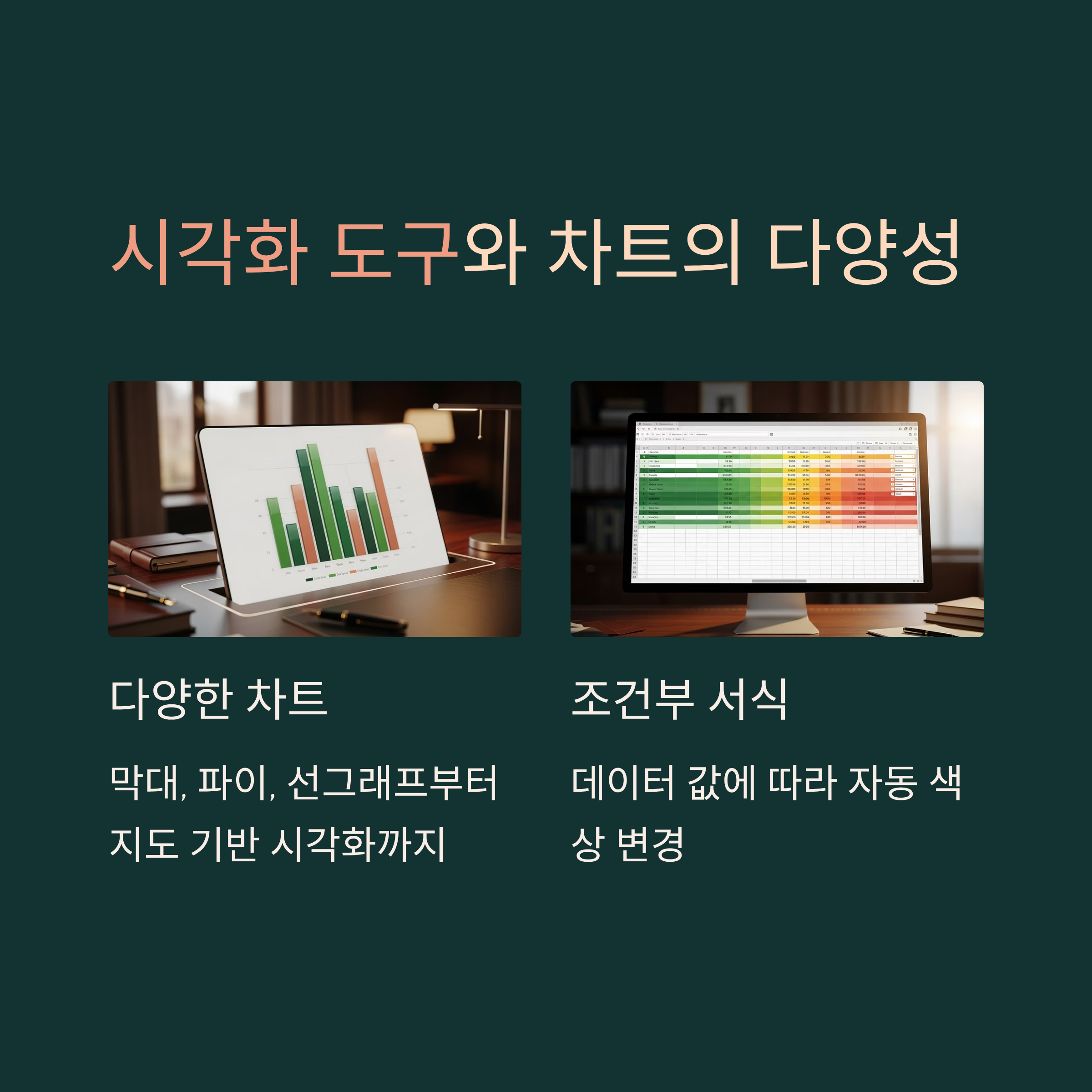 스파크라인이나 데이터 막대 같은 기능도 활용할 수 있어서, 숫자만 가득한 표를 훨씬 보기 좋게 만들 수 있어요. 비즈니스 리포트나 마케팅 데이터 시각화에도 정말 적합하죠.