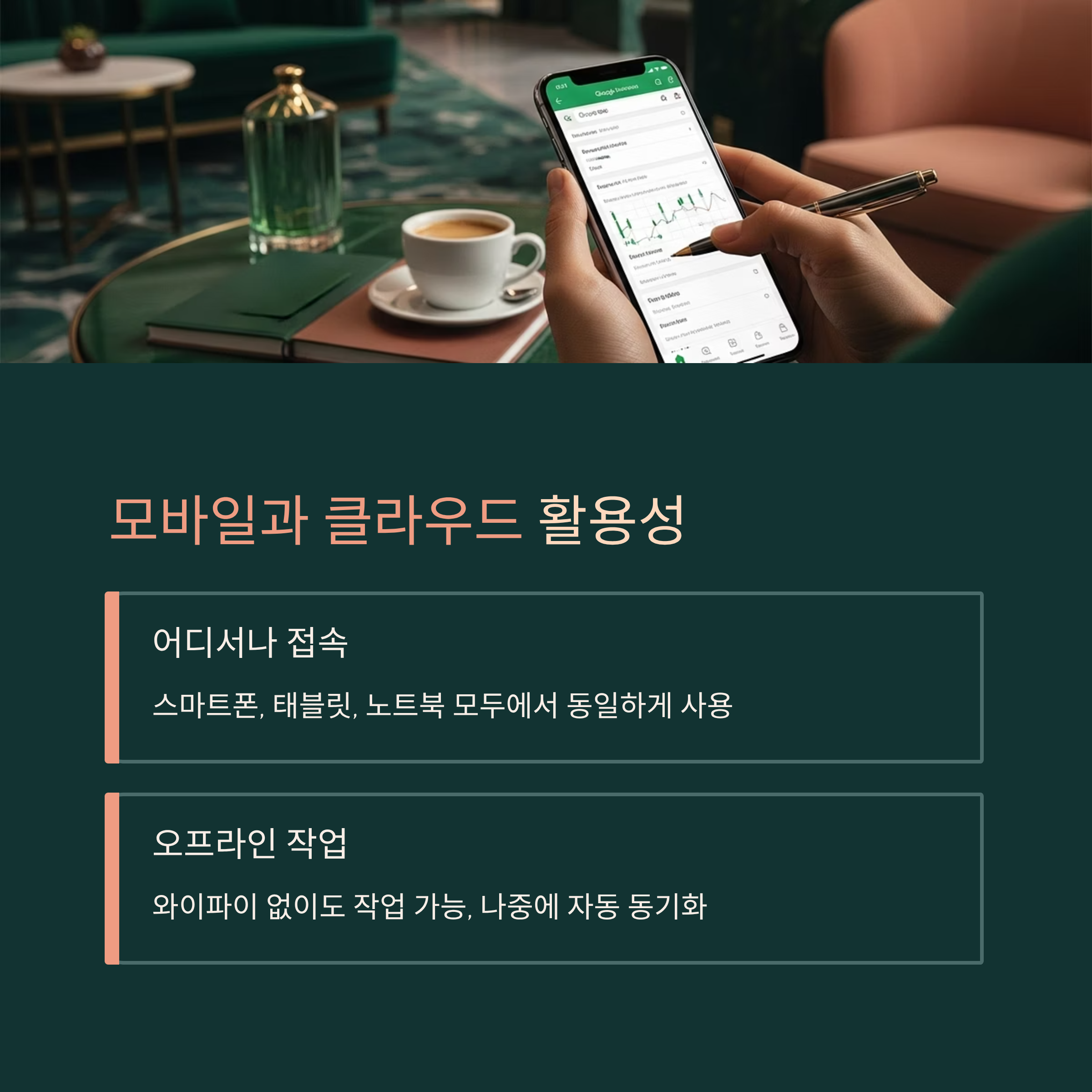 구글 스프레드시트는 언제 어디서든 접속 가능하다는 점이 정말 큰 장점이에요. 스마트폰, 태블릿, 노트북 모두에서 동일하게 사용할 수 있고, 데이터는 자동으로 동기화돼요.