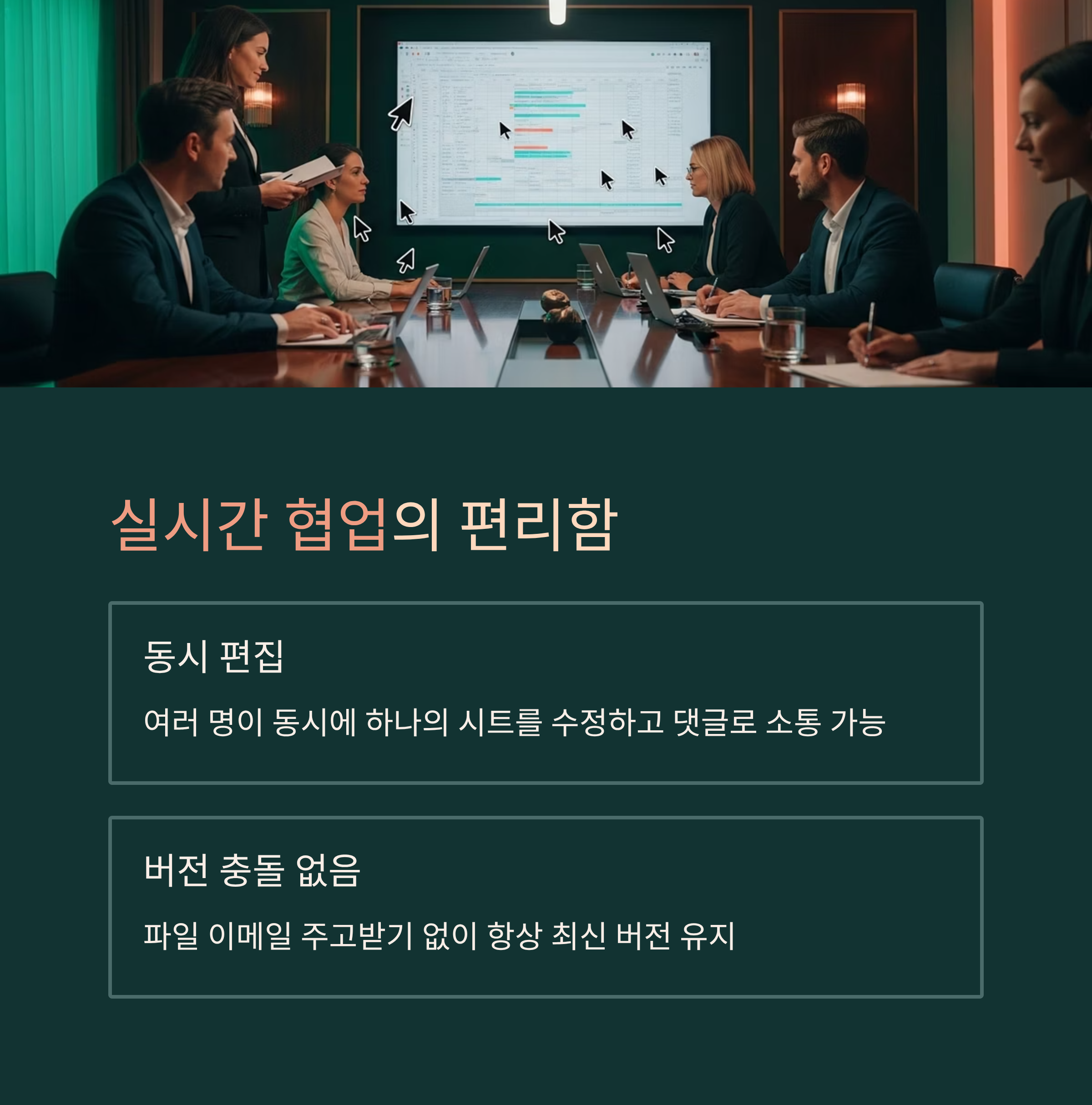 이런 기능은 엑셀에서도 클라우드 기반으로 일부 가능하지만, 구글 스프레드시트는 처음부터 이런 시스템을 기반으로 만들어졌기 때문에 더 안정적이고 직관적으로 작동해요.