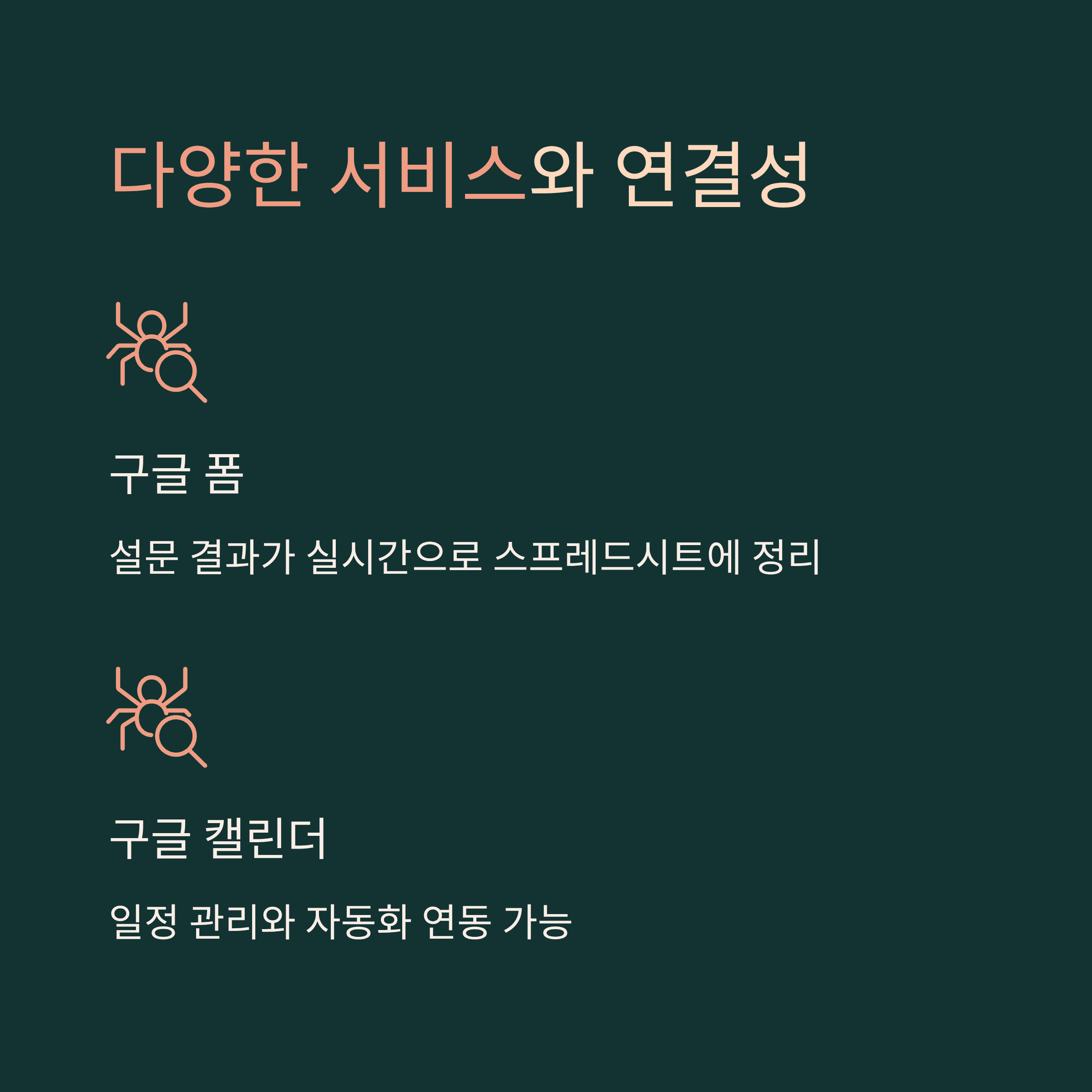 또한 구글 드라이브, 구글 캘린더, 지메일 등과도 연동이 가능해서, 일정 관리나 이메일 자동화 같은 일도 가능해요. 업무 흐름 전체를 자동화할 수 있는 도구로 확장된다는 점에서 굉장히 유용하답니다.