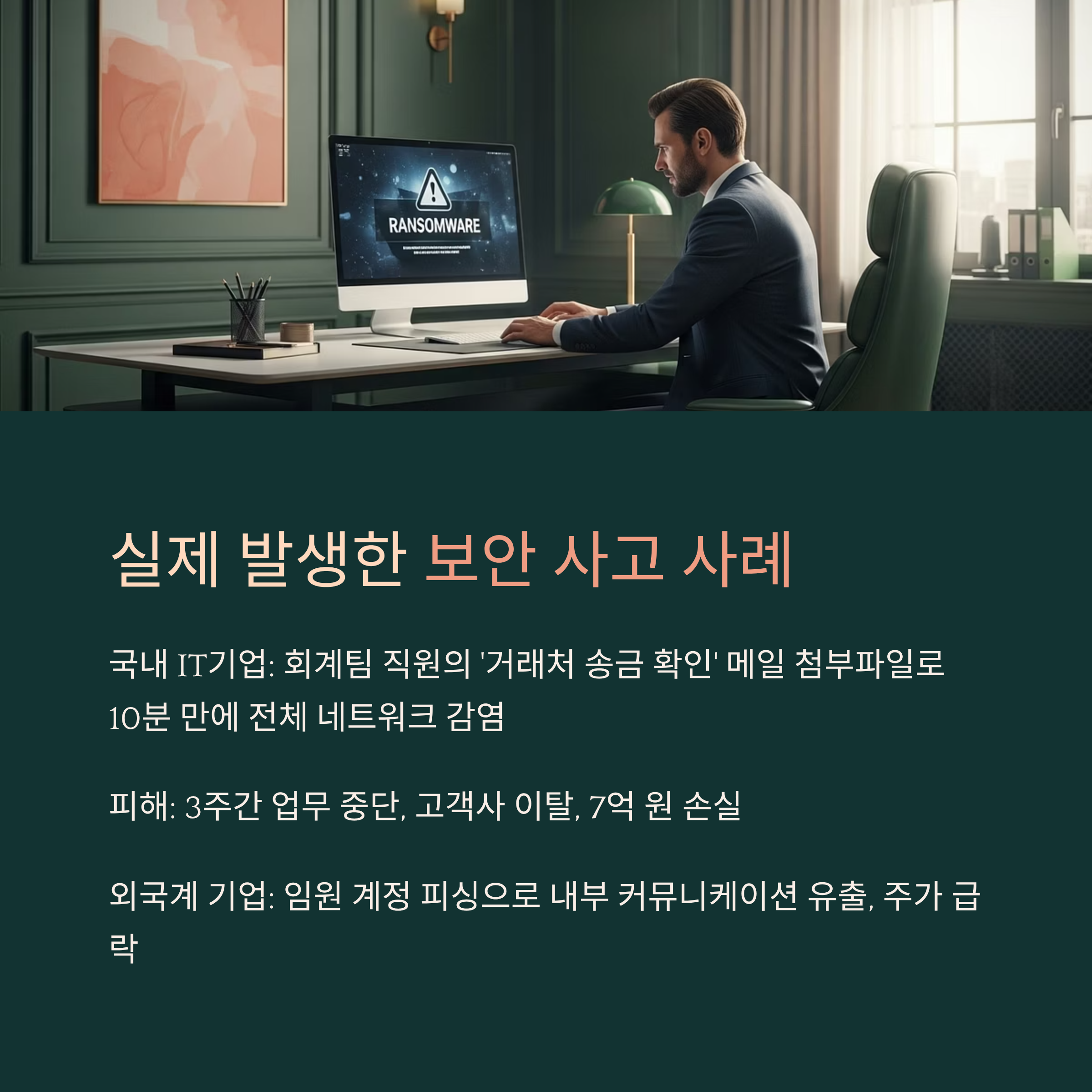 | 국내 IT 기업 B사 | 엑셀 첨부파일 피싱 | 7억 원 + 고객 이탈 | 보안 체계 전면 개편 |