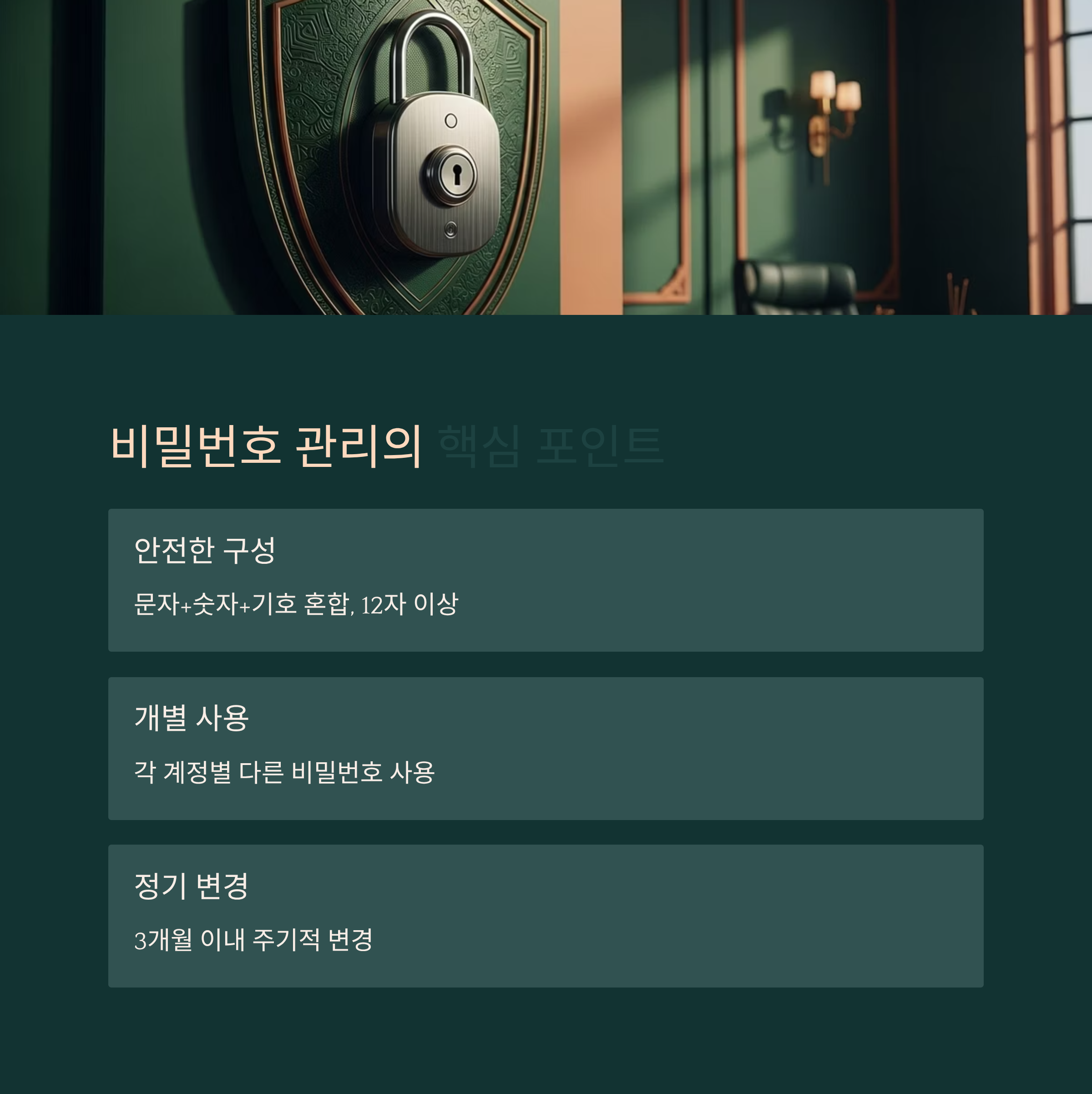 비밀번호는 영어 대소문자, 숫자, 특수문자를 조합해 12자 이상으로 설정하는 게 좋아요. 그리고 최소 3개월마다 한 번은 변경해야 보안성이 높아져요. 기억하기 어렵다면 패스워드 매니저 앱을 활용하는 것도 좋은 방법이에요.