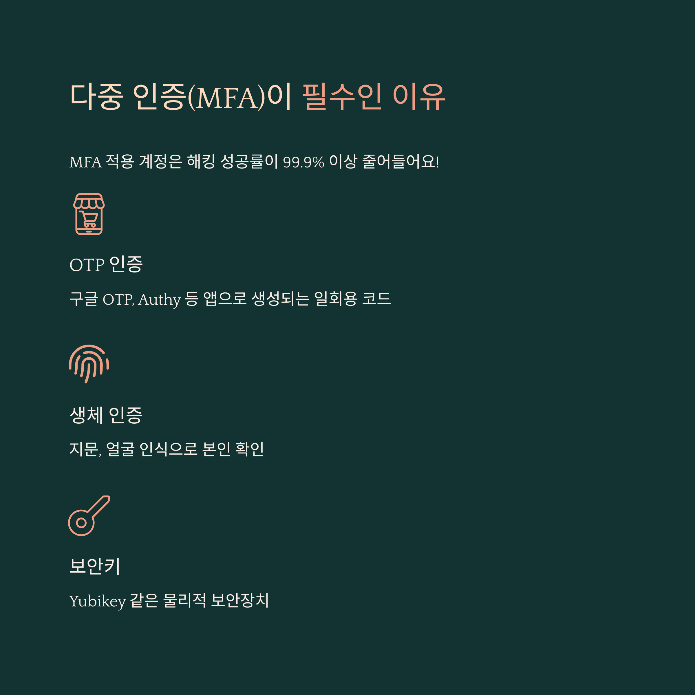 왜 이렇게까지 해야 할까요? 바로 해커가 비밀번호를 알아내더라도, 2차 인증 수단이 없으면 로그인을 못 하게 막는 장치이기 때문이에요. 실제로 MFA를 적용한 계정은 해킹 성공률이 99.9% 이상 줄어든다고 해요.