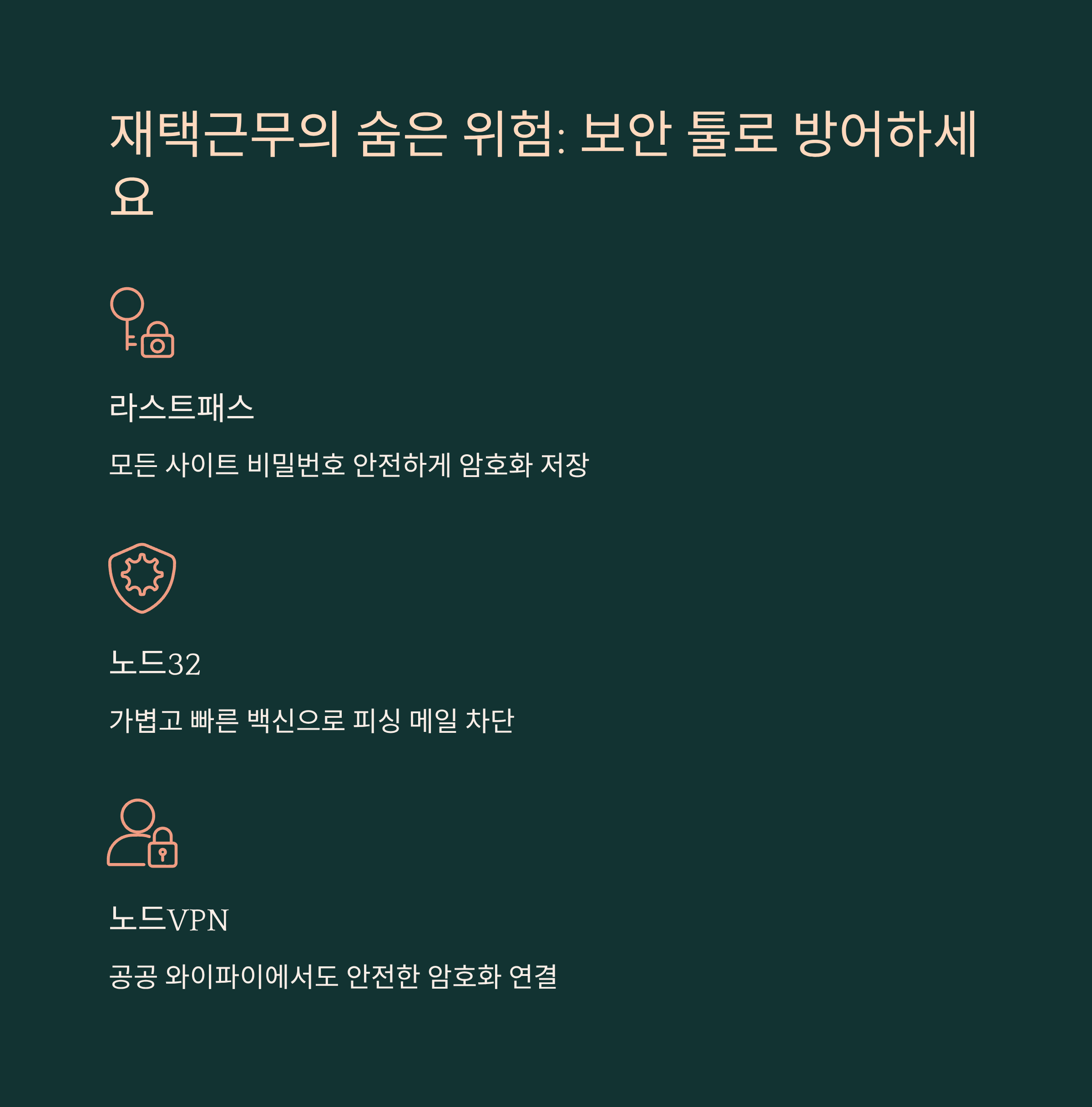 재택근무 환경에서는 보안이 정말 중요해요. 회사 서버를 쓰는 것도 아니고, 사내 보안망 밖에서 일하니까 해킹, 정보 유출, 바이러스 등 위험이 곳곳에 숨어 있거든요. 특히 중요한 문서나 고객 정보를 다루는 직군이라면, 반드시 보안 툴을 갖추고 있어야 해요. 그중에서도 많이 사용되는 툴로는 라스트패스(LastPass), 노드32(NOD32), 노드VPN(NordVPN)이 있어요.