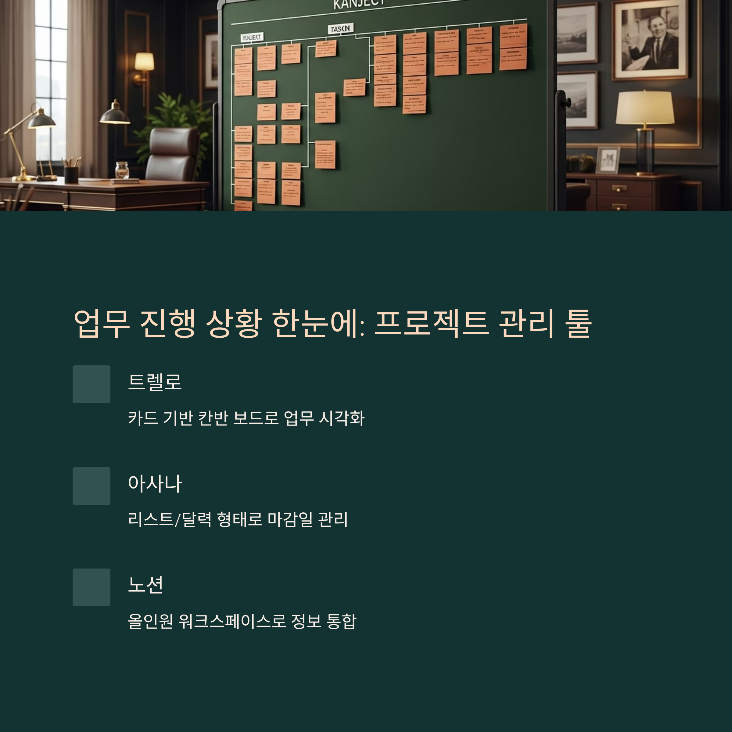 재택근무의 가장 큰 고민 중 하나는 ‘내가 지금 어떤 업무를 어디까지 했는지’ 팀원들이 모를 때가 많다는 거예요. 그래서 프로젝트를 체계적으로 관리해주는 툴이 꼭 필요하답니다. 이 역할을 해주는 대표 툴이 바로 트렐로(Trello), 아사나(Asana), 노션(Notion)이에요.