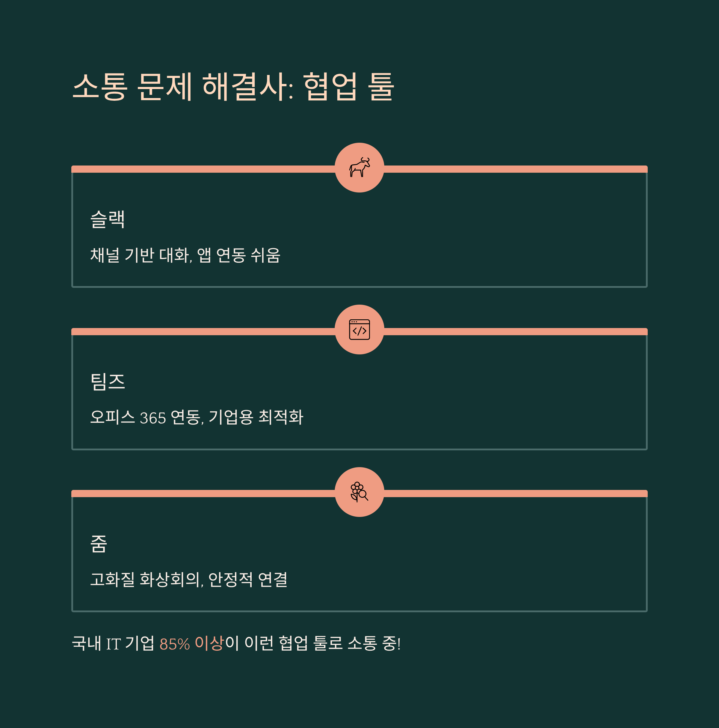슬랙은 채널 기반으로 구성되어 있어, 프로젝트별 혹은 주제별로 대화를 나누기 정말 좋아요. 그리고 이모지 반응 기능은 단순한 피드백도 가볍고 유쾌하게 전달할 수 있게 해줘요. 팀즈는 오피스 365와 연동되기 때문에 기업 환경에 딱 맞고, Zoom은 전 세계적으로 가장 많이 사용되는 화상 회의 도구로 고화질 영상과 가벼운 접속이 강점이에요.