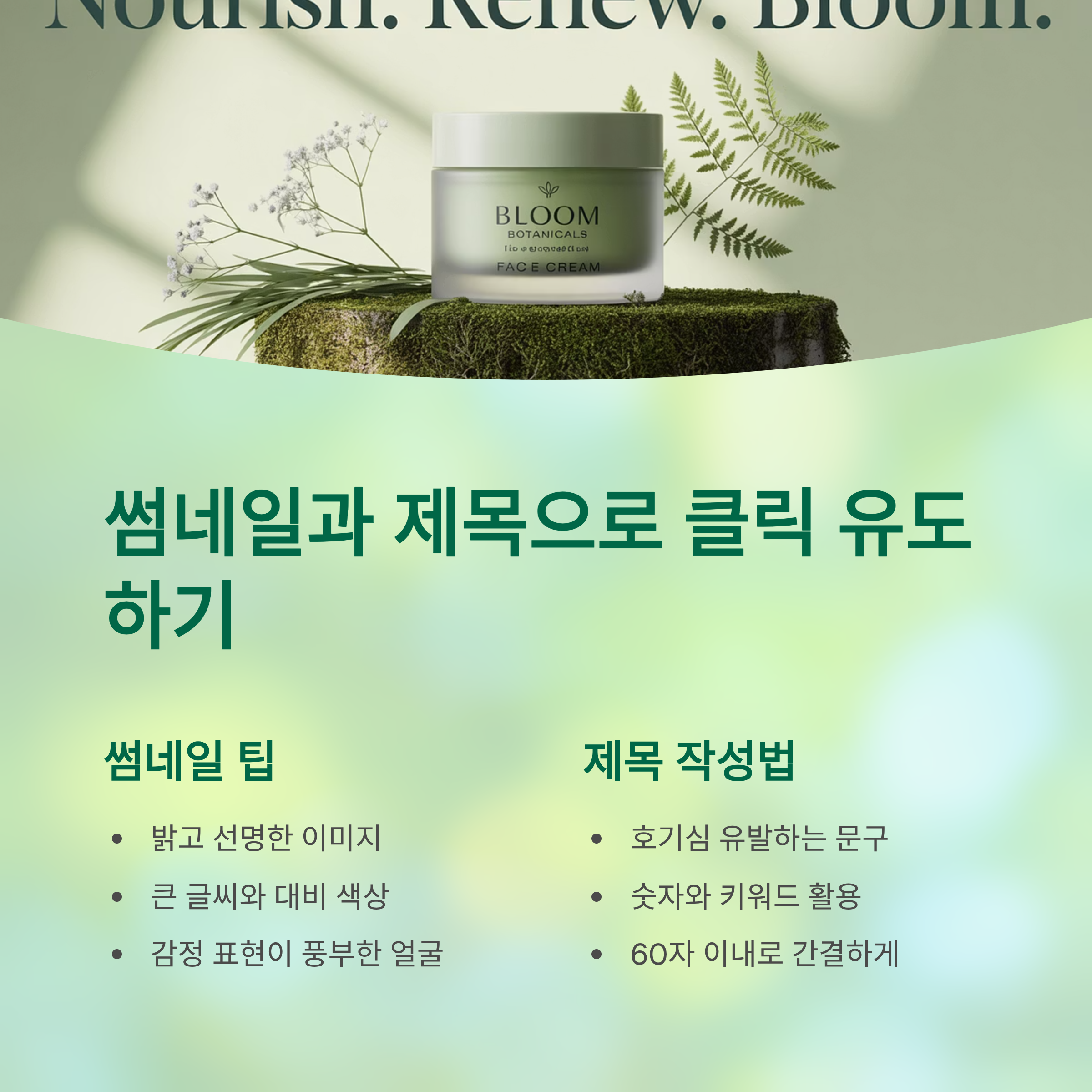 구독자를 늘리려면 영상이 먼저 클릭돼야 해요. 아무리 좋은 콘텐츠도 썸네일이 눈에 띄지 않으면 사람들은 보지 않거든요. 썸네일은 최대한 간결하게! 텍스트는 3~5단어 이하로, 눈에 확 띄는 색상과 얼굴 표정, 행동이 있는 이미지가 좋아요.