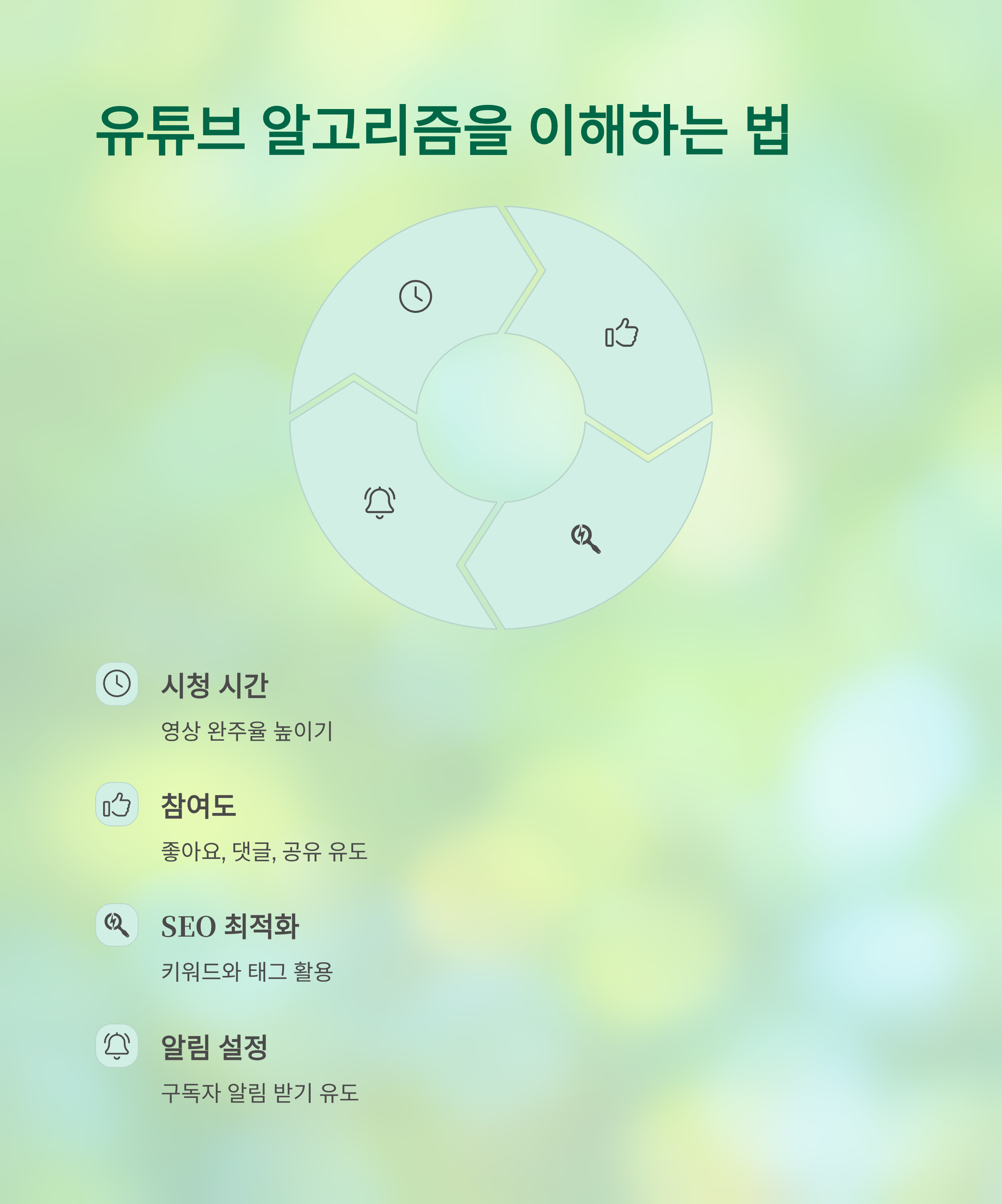 유튜브 알고리즘은 단순하지 않아요. 클릭률, 시청 지속 시간, 댓글, 좋아요, 공유, 커뮤니티 반응 등 다양한 요소가 결합돼요. 이 중에서도 '시청 지속 시간'이 가장 중요한 요소예요. 즉, 끝까지 보게 만드는 영상이 추천에 잘 뜬다는 뜻이에요.