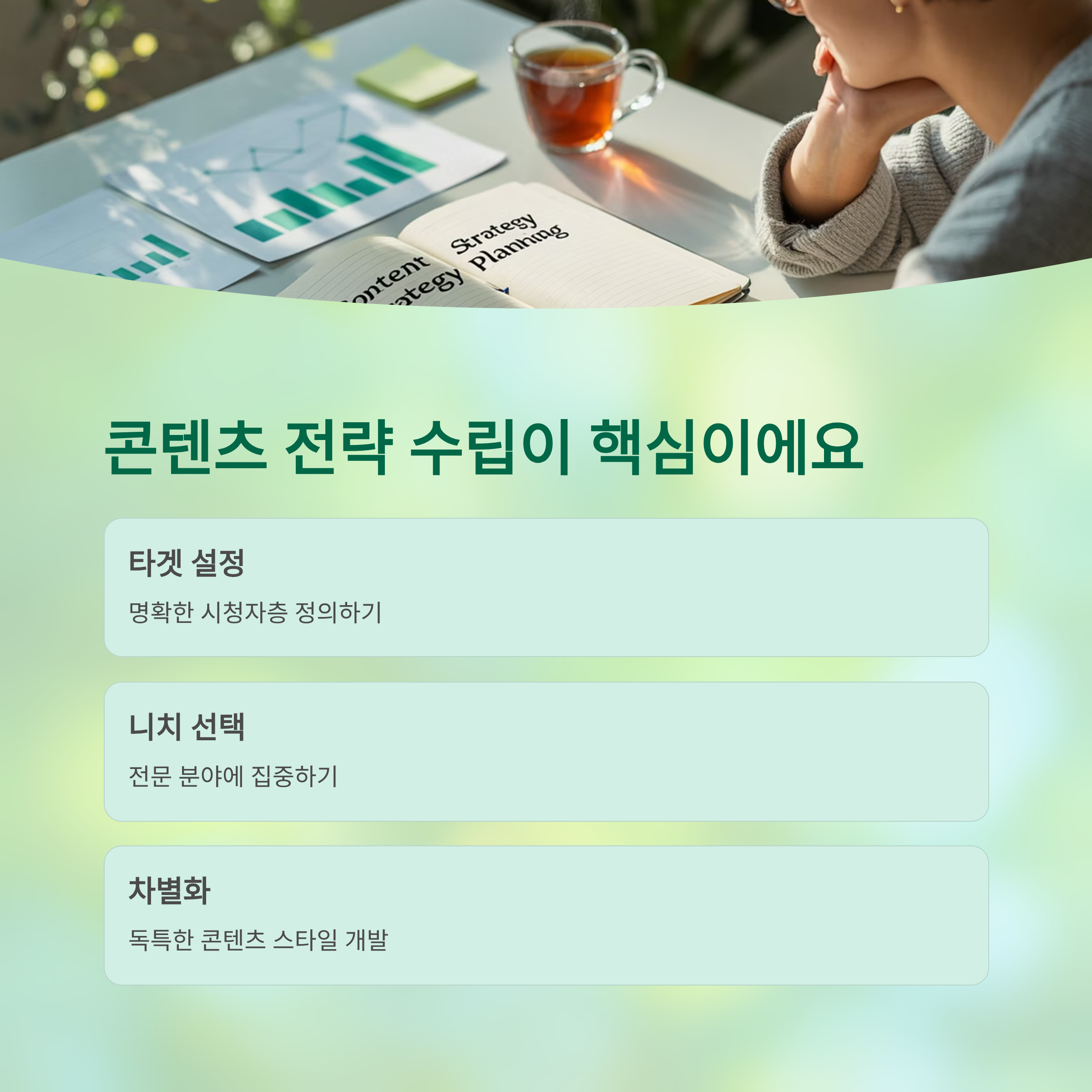 채널 시작할 땐 ‘조회수=구독자’가 아니란 걸 명심해야 해요. 브랜딩을 염두에 두고 나만의 콘텐츠 정체성을 먼저 정리해보는 게 핵심 전략이랍니다.