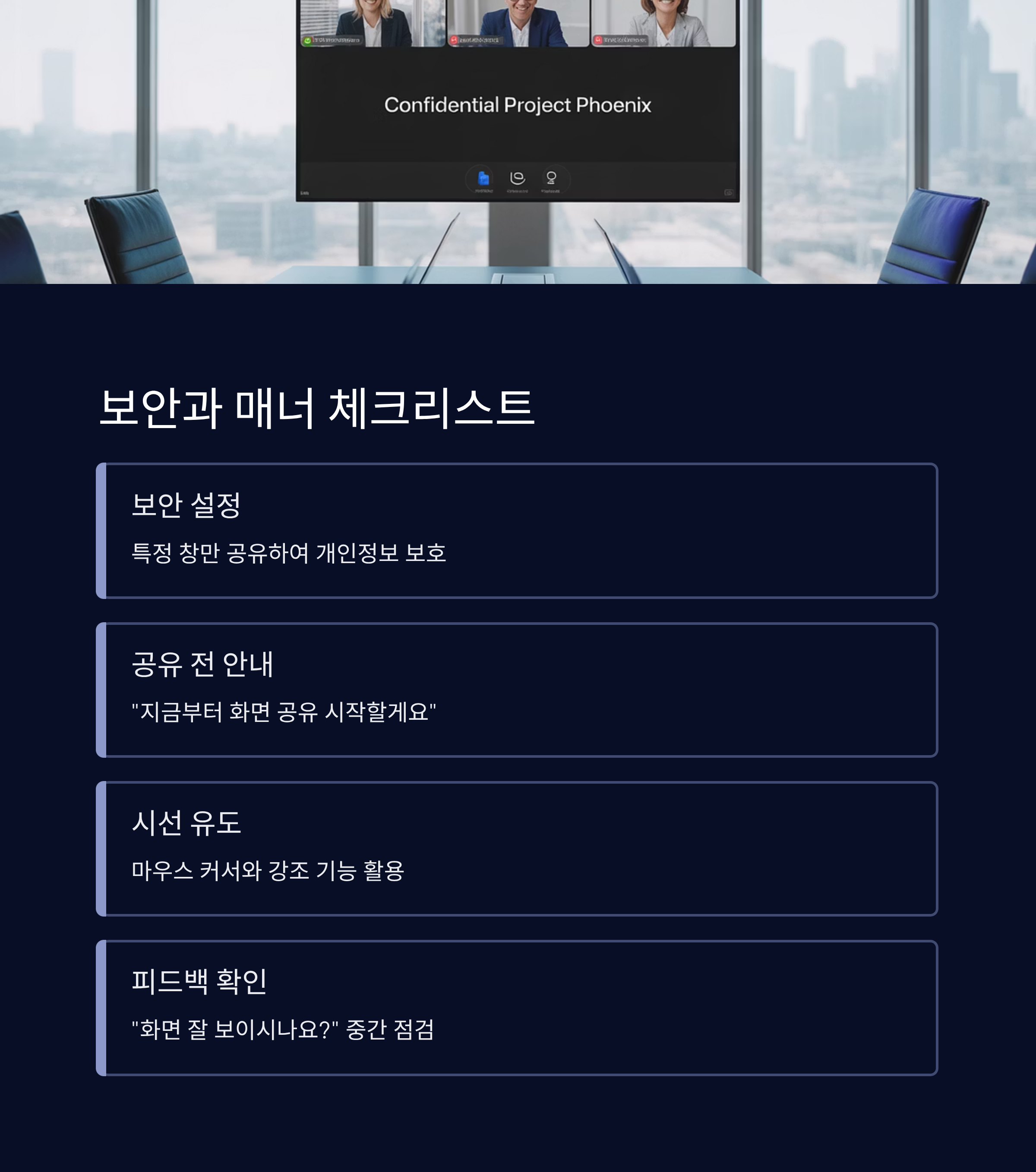화면 공유는 강력한 도구지만, 동시에 민감한 정보가 유출될 가능성도 있어요. 특히 클라이언트 정보, 사내 기밀 문서, 개인 사진이나 메시지 등이 실수로 노출되는 걸 막기 위해 보안에 더욱 신경 써야 해요.