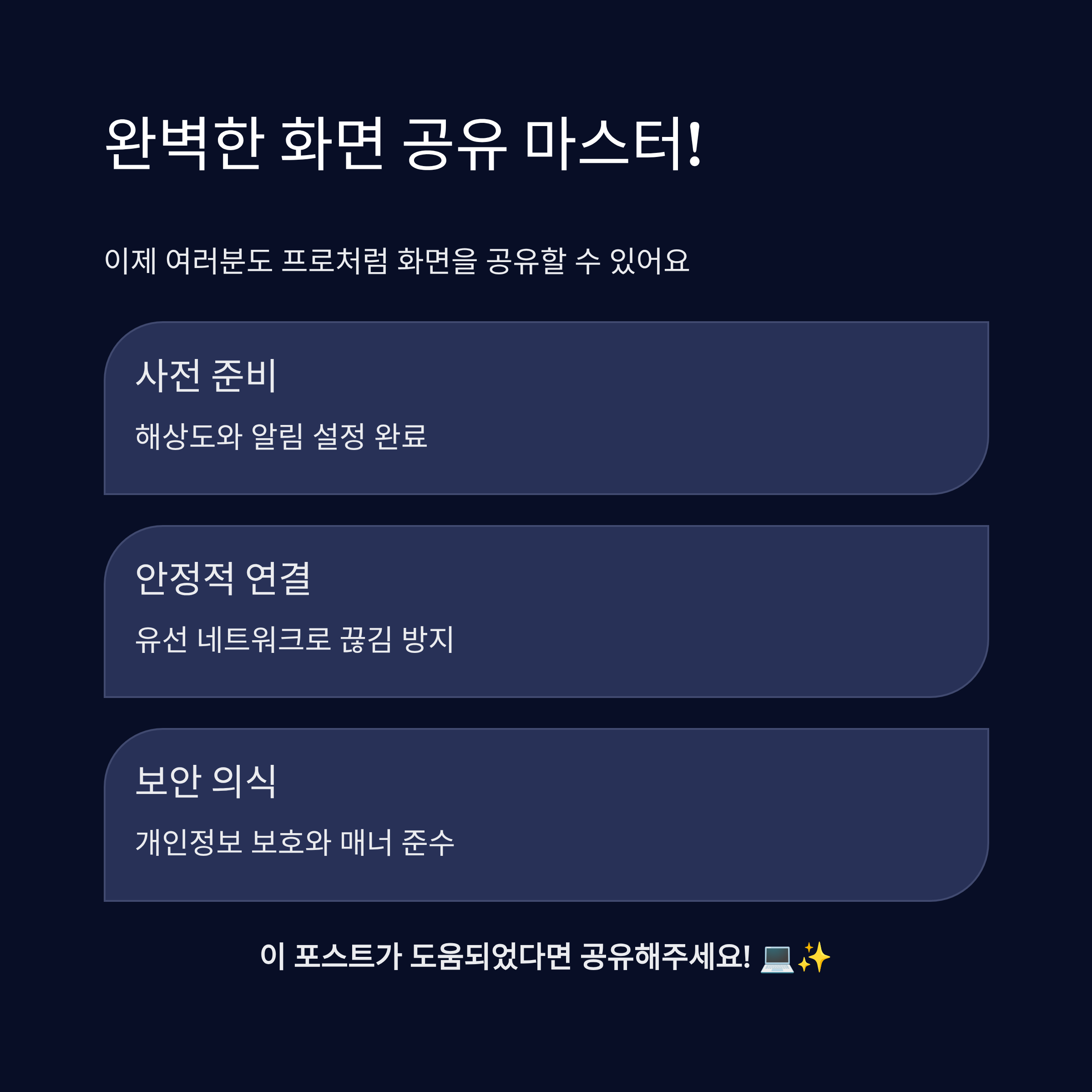 이렇게 사전에 준비만 잘 해두면 화면 공유는 더 이상 스트레스가 아닌, 강력한 커뮤니케이션 도구가 되어줄 거예요. 그리고 이런 습관이 들면 발표나 미팅에서 실수도 훨씬 줄어들게 된답니다.