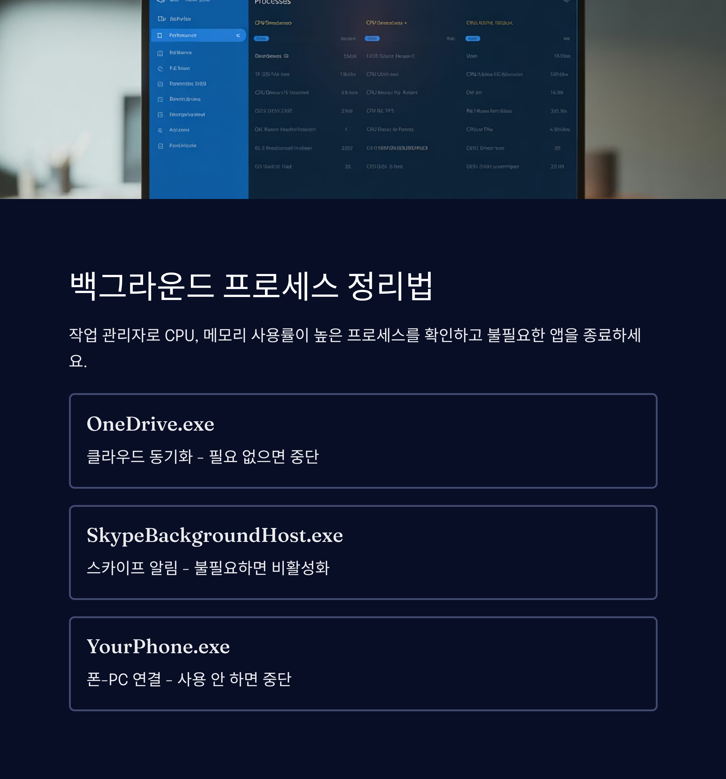 | OneDrive.exe | 클라우드 동기화 | 필요 없음 | 파일 동기화 중단 |