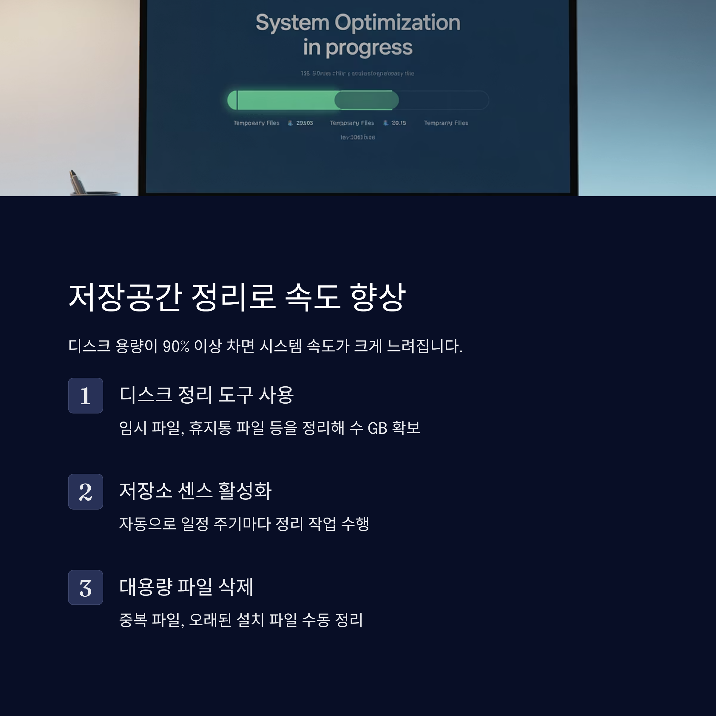 마지막으로 대용량 불필요 파일, 중복 파일, 오래된 설치 파일 등을 수동으로 찾고 삭제하는 것도 중요해요. CCleaner 같은 도구를 사용하면 손쉽게 시스템 내부를 청소할 수 있어요. 깔끔한 저장 공간은 곧 빠른 컴퓨터의 기본이니까요! 🧼