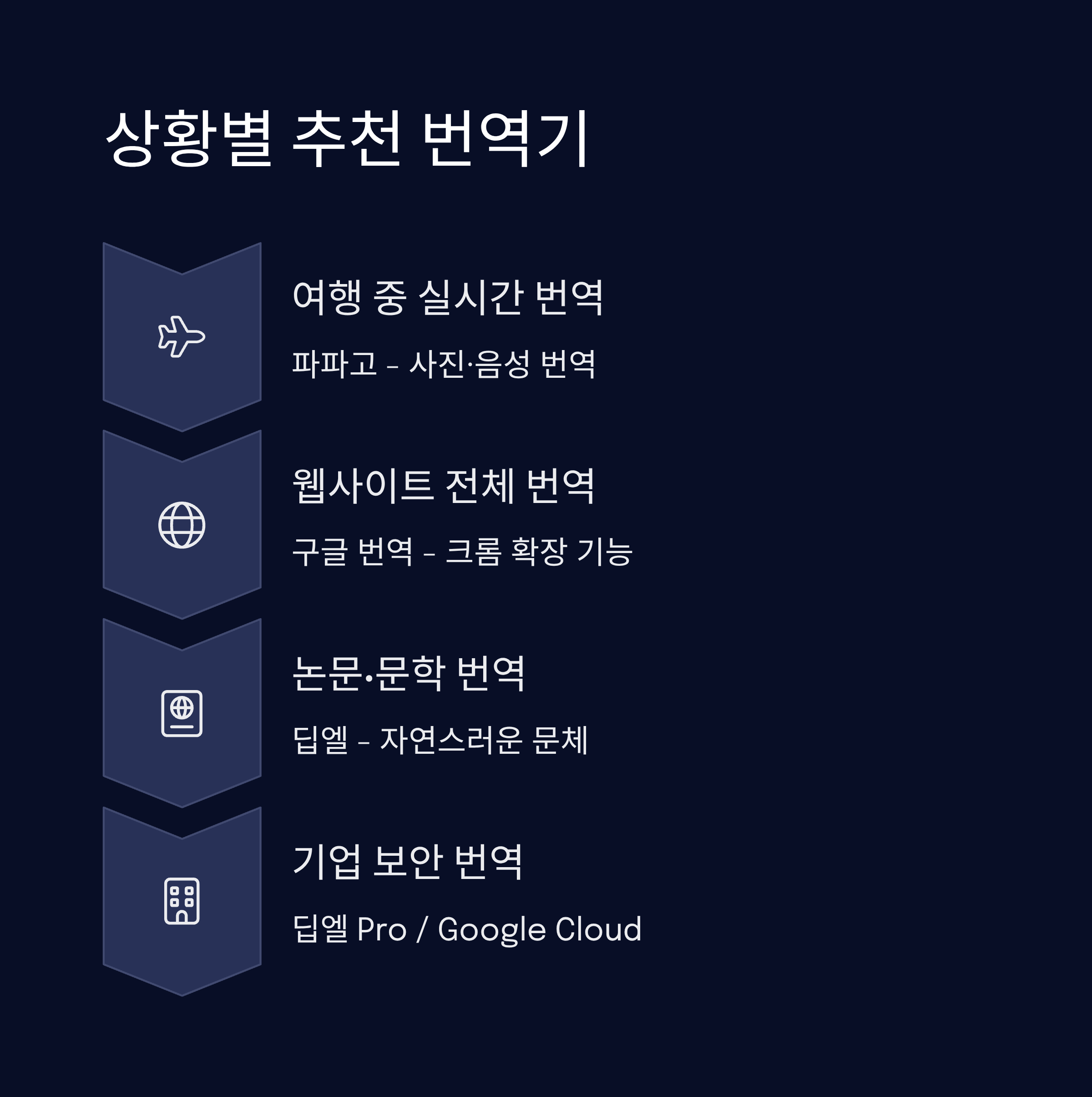 세 번역기의 특징을 모두 살펴봤다면, 이제는 "언제 어떤 번역기를 써야 하는지"가 가장 궁금할 거예요. 각자의 장단점이 있기 때문에 상황에 따라 선택이 달라져요. 그래서 상황별로 추천해드릴게요.
