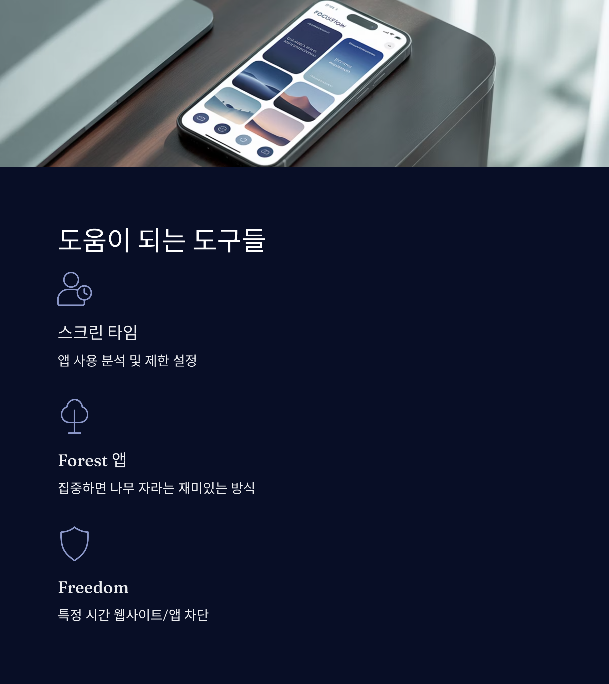 | FocusMe | 앱/사이트 차단 | 업무 시간 지정 필수 |