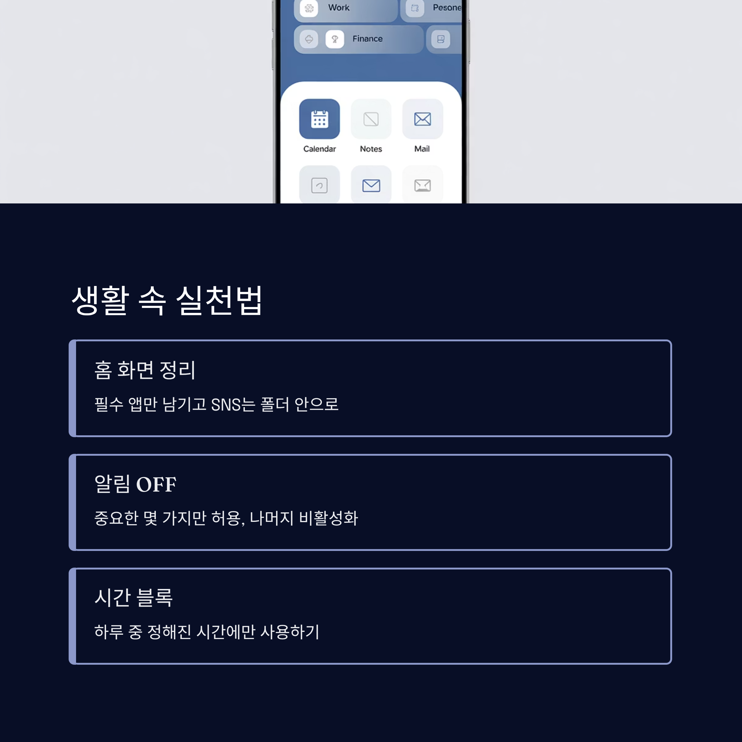 | 홈 화면 정리 | 필수 앱만 남기기 | 무의식 사용 감소 |