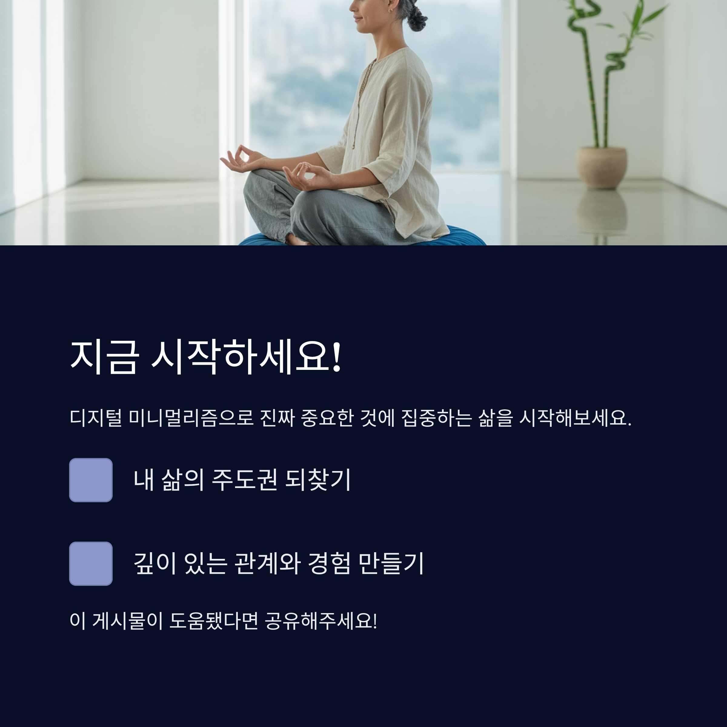 디지털 미니멀리즘은 자기 자신을 다시 만나게 해줘요. 내 삶에서 정말 중요한 것에 시간을 투자하고, 가짜 정보와 자극에서 벗어나는 삶을 살아보세요. 지금이 바로 시작할 때예요! 💫