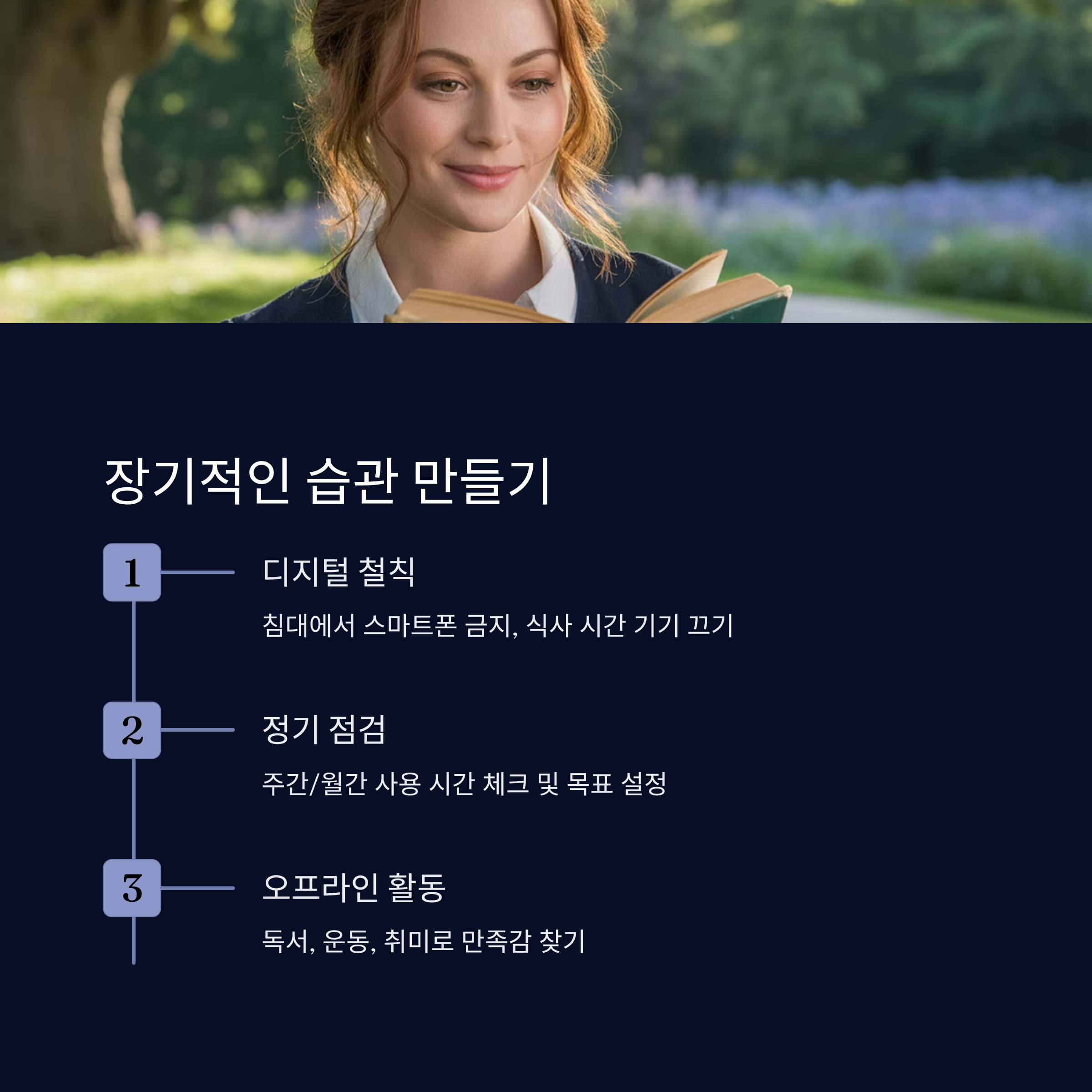 세 번째는 오프라인에서 만족감을 줄 수 있는 활동을 찾는 거예요. 가족이나 친구와 산책하기, 독서, 악기 배우기, 요리하기 등 나를 행복하게 만드는 취미를 꾸준히 해보세요. 디지털보다 훨씬 더 오래 남는 기쁨이 있어요.