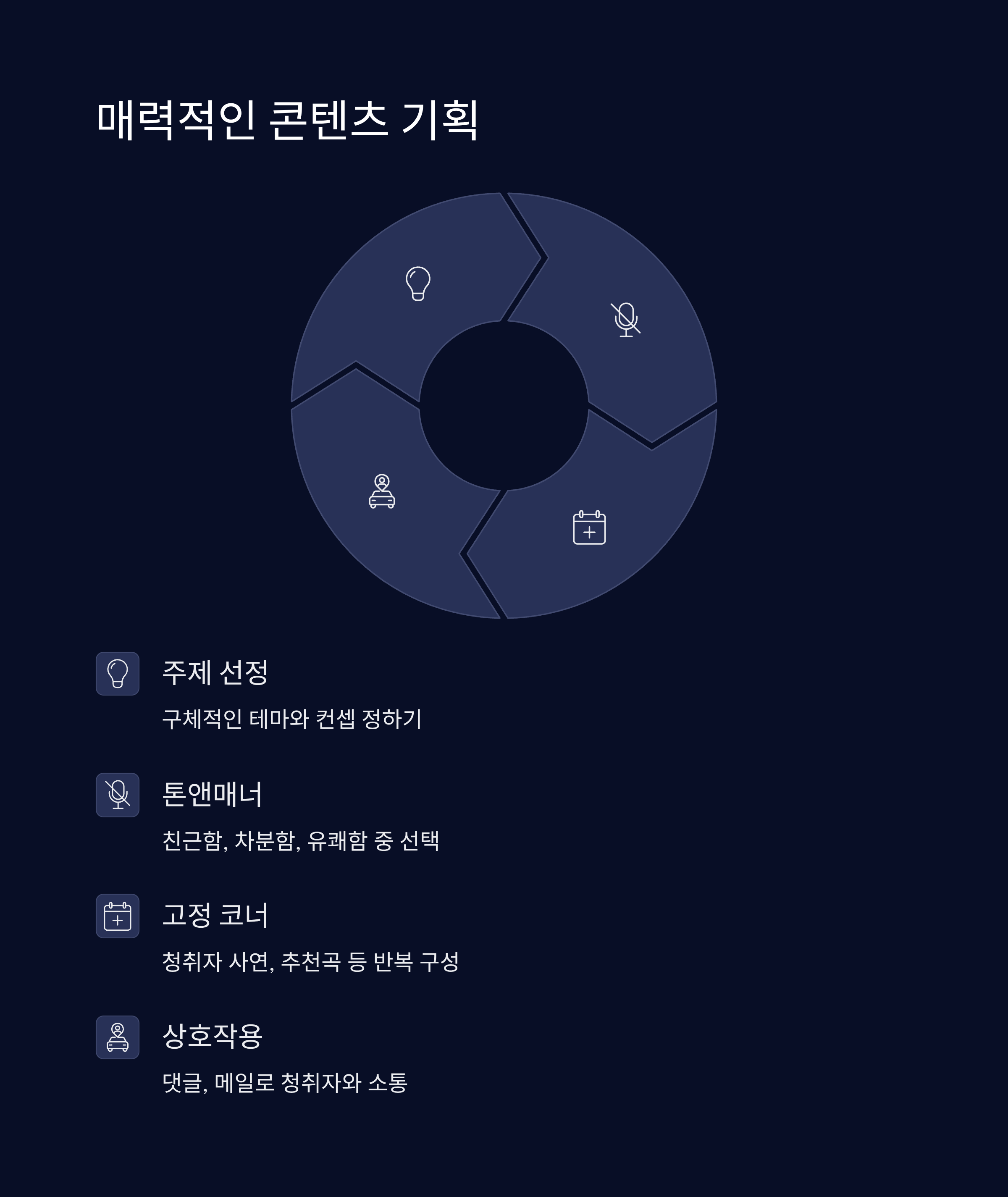 또한 시즌제 운영도 고려해보세요. 방송을 매일 또는 매주 계속하기 어려운 경우라면, 4주 단위로 시즌을 만들어 ‘시즌1- 직장인의 밤’, ‘시즌2- 음악 속 여행’처럼 콘셉트를 나누는 것도 좋답니다.
