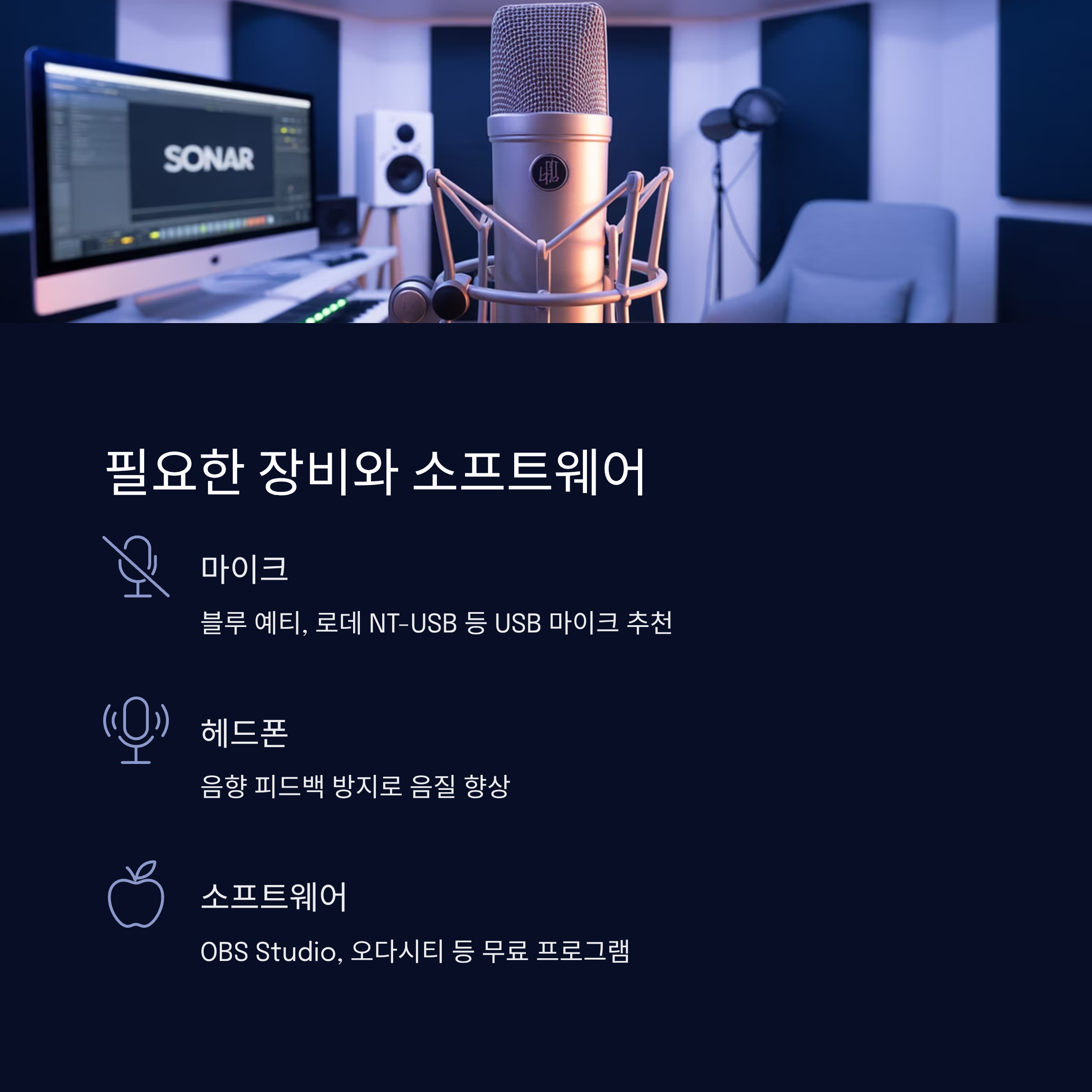 A1. 무료 툴과 기본 장비만 사용하면 거의 비용이 들지 않아요. 마이크와 헤드폰만 마련해도 충분히 시작할 수 있으며, 10만 원 내외로도 퀄리티 있게 구성 가능하답니다 🎧