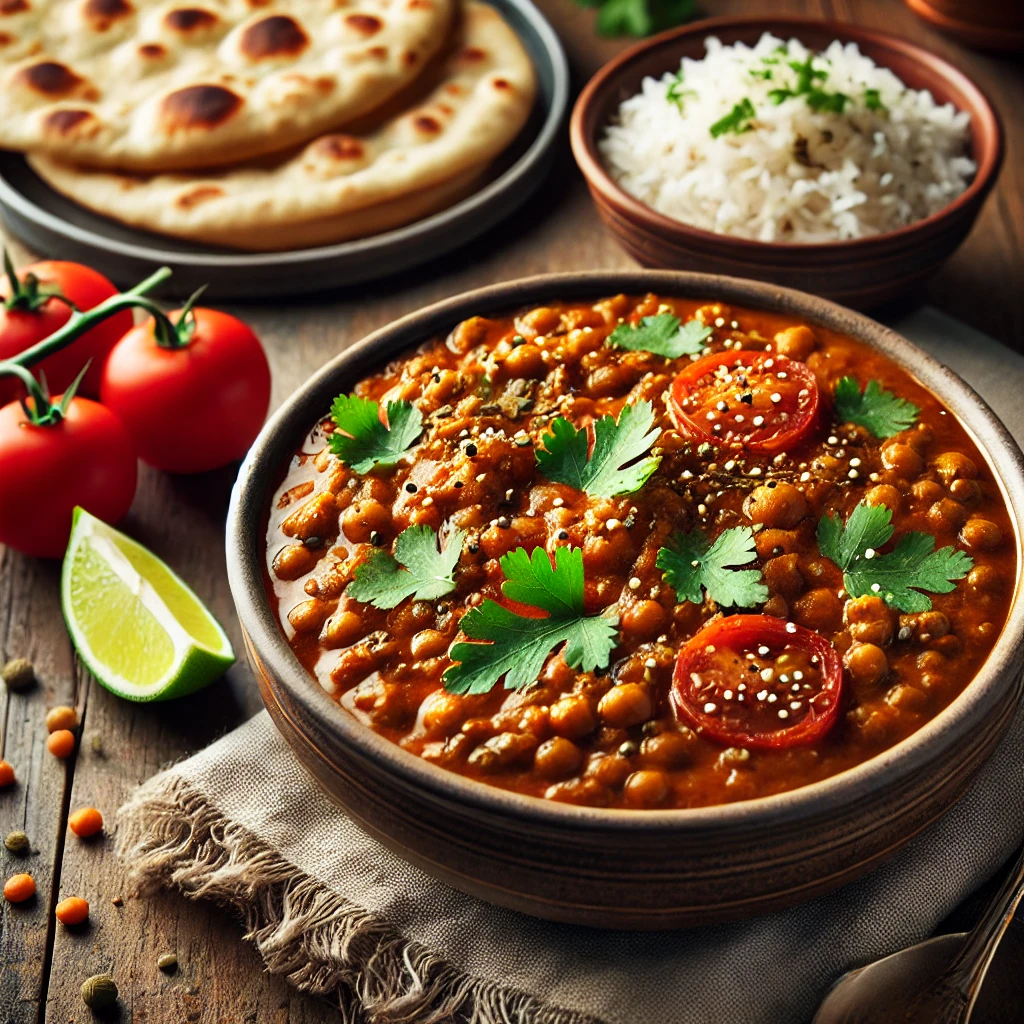재료: 렌틸콩, 토마토, 양파, 마늘, 생강, 카레 가루, 코코넛 밀크, 시금치, 고수